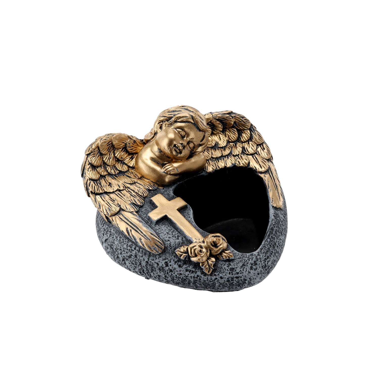 Elegantna vaza u obliku srca s motivom anđela unosi u grobne aranžmane dostojanstvo i simboliku sjećanja. Izrađena je od izdržljivog cementa u tamnosivoj boji sa zlatnim detaljima, pa lijepo ističe cvjetne kompozicije i dekoracije. Praktična veličina omogućuje lako sadjenje sezonskog cvijeća; vaza nema odvodnu rupu.