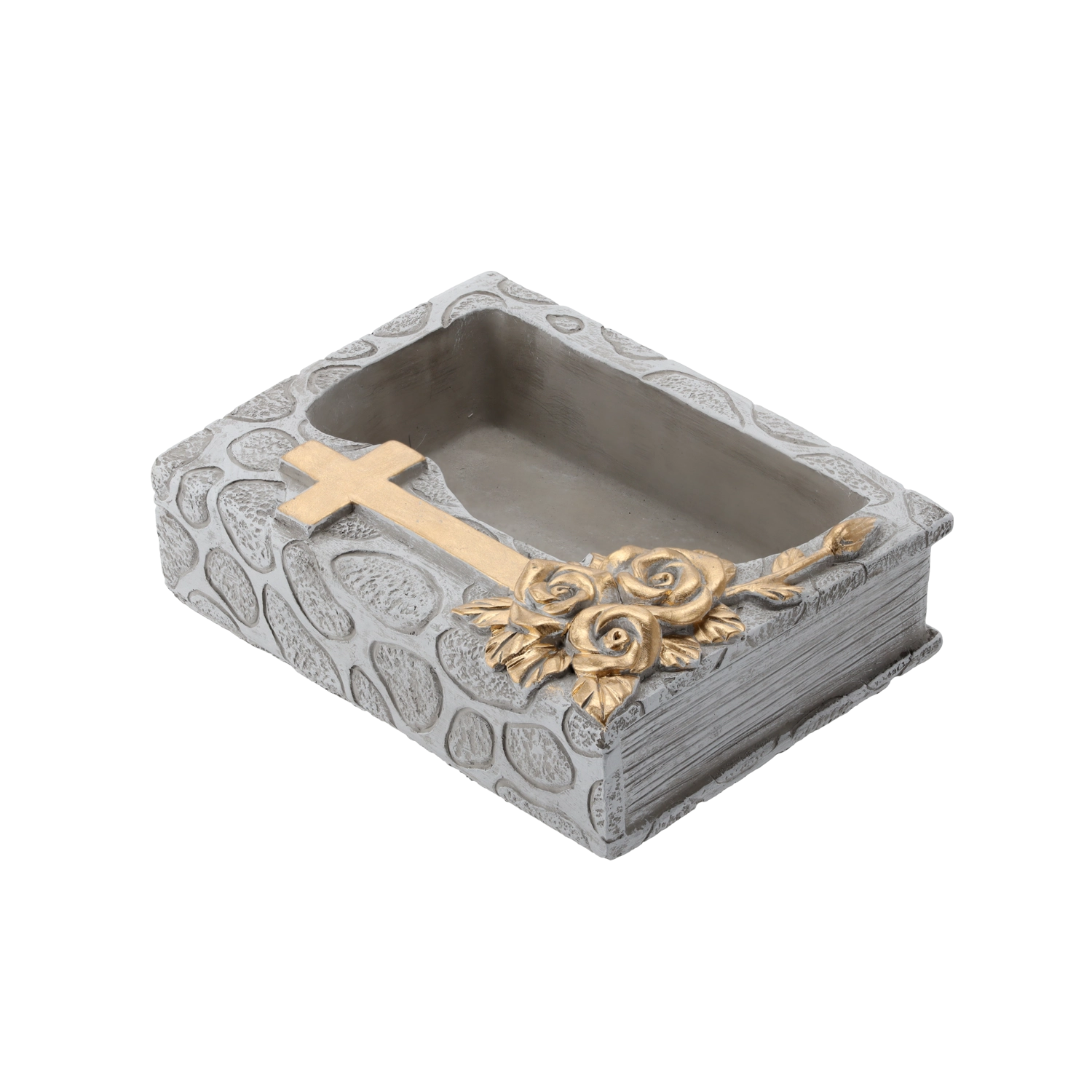 Ova cementna posuda u obliku knjige odličan je izbor za izradu trajnih i ukusnih pietetskih dekoracija. Siva površina s suptilnim zlatnim akcentima naglašava simboliku sjećanja i lako se kombinira s prirodnim i umjetnim cvijećem.