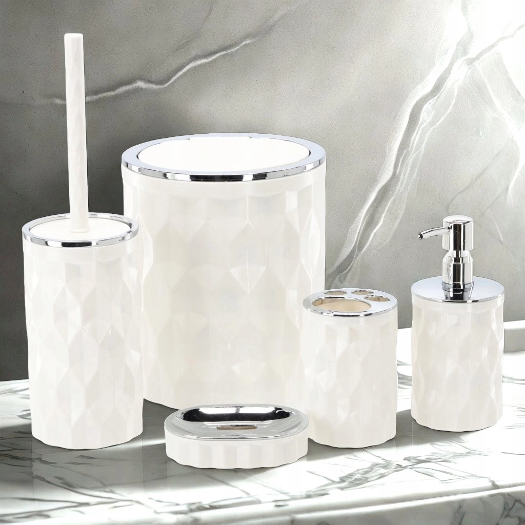 Stilski peterodijelni set kupaonskih dodataka u elegantnoj bijeloj boji donosi sve što trebate za svakodnevnu higijenu i urednost. Zahvaljujući usklađenom dizajnu s modernim detaljima i praktičnom rasporedu elemenata, dobit ćete čist, harmoničan izgled kupaonice i jednostavno održavanje. Set sadrži koš za otpad, držač s WC četkom, dozator za tekući sapun, stalak za četkice za zube i posudicu za sapun.