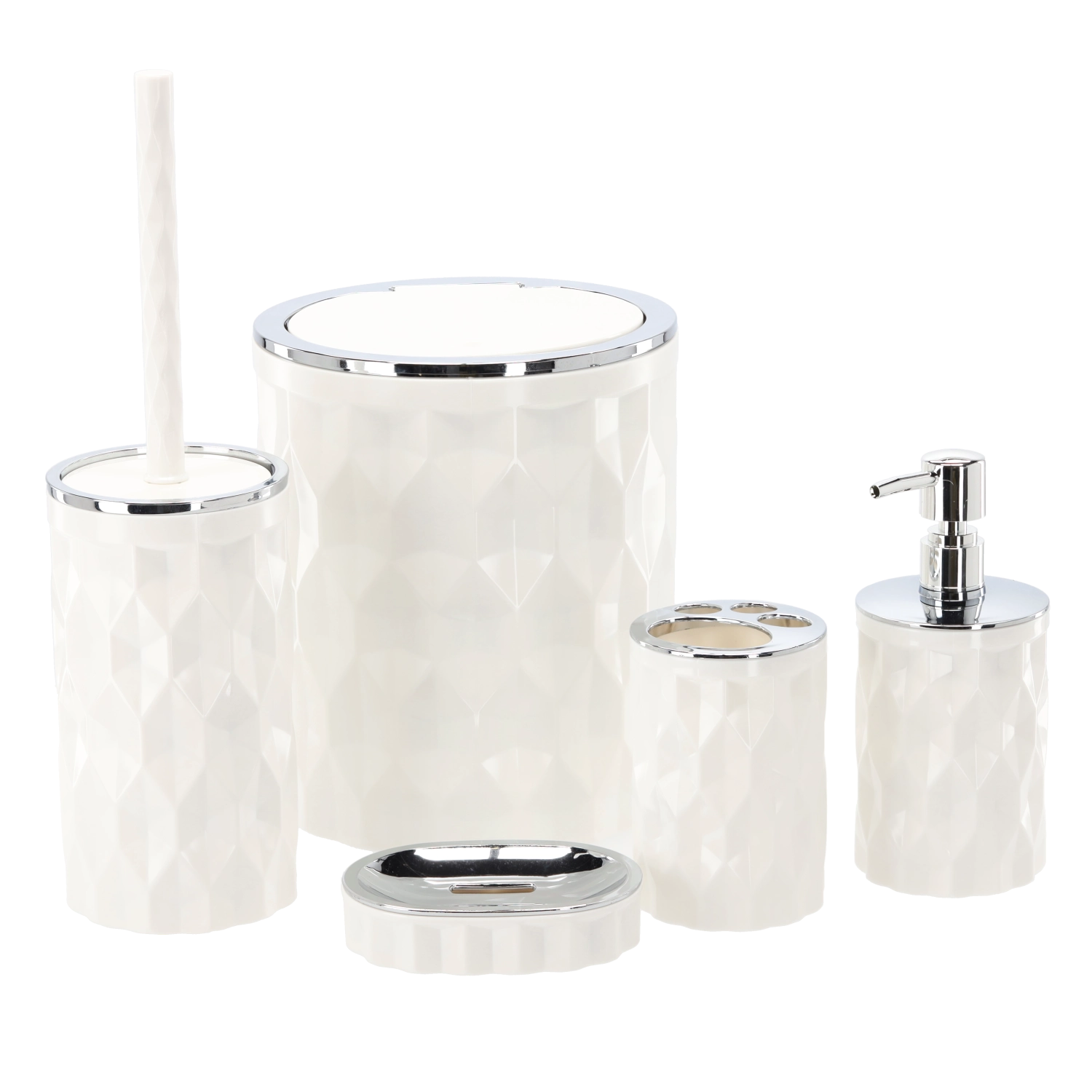 Pet osnovnih dodataka u ujednačenom dizajnu: koš, WC četka, dozator sapuna, držač za četkice i posudica za sapun. Idealan početak za svaku kupaonicu.