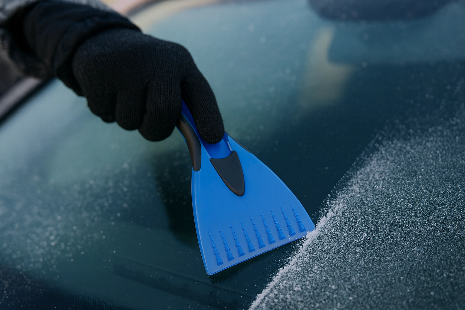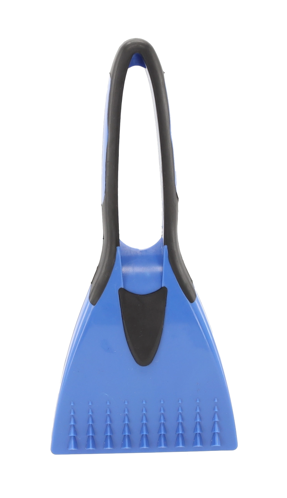 Nazubljeni zubi brzo razbijaju debeli sloj leda, dok široki glatki rub u trenu dovršava čišćenje stakla bez mrlja.