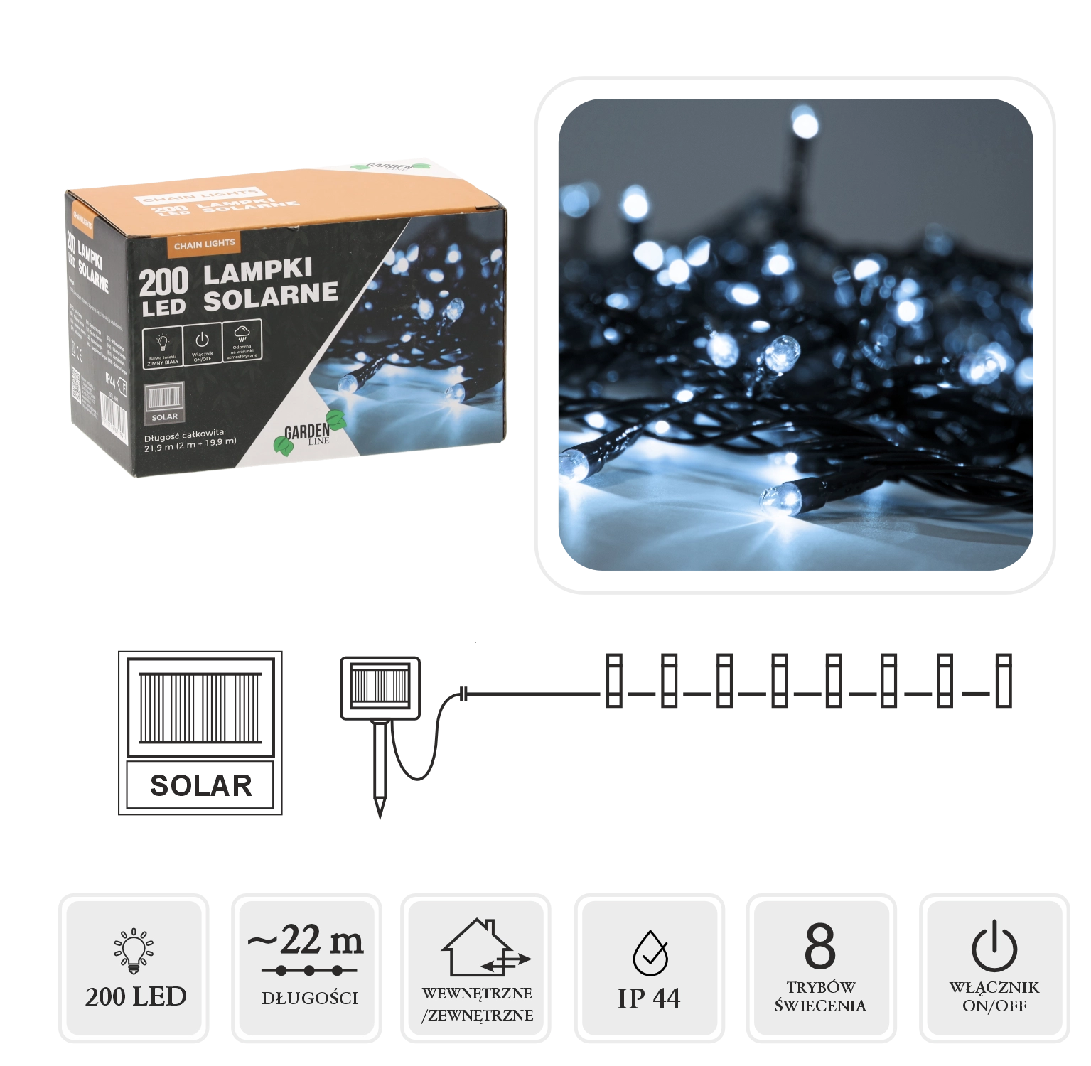 Solarni lanac s 200 LED dioda stvara elegantan, ledeno bijeli sjaj oko grmlja, pergola, paviljona i rukohvata. Zahvaljujući napajanju putem solarnog panela ne zahtijeva utičnicu, danju se puni, a navečer se automatski uključi. Otpornost IP44 osigurava pouzdan rad na otvorenom tijekom cijele sezone.
