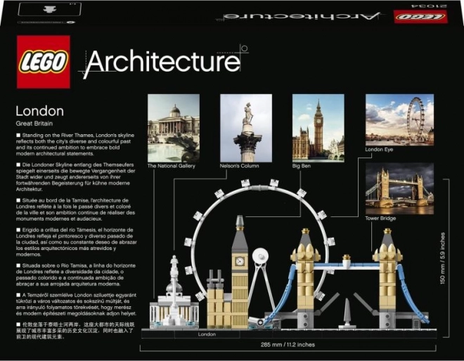 Set iz kolekcije LEGO Architecture Skyline vjerno prikazuje najpoznatije londonske znamenitosti u realističnim proporcijama i bojama. Na elegantnom postolju s ukrasnom pločicom „London” nalaze se National Gallery, Nelson’s Column, London Eye, Big Ben (Elizabeth Tower) i most Tower Bridge. Prozirni elementi u osnovi dočaravaju tok rijeke Temze, pa model izgleda sjajno iz svakog kuta.