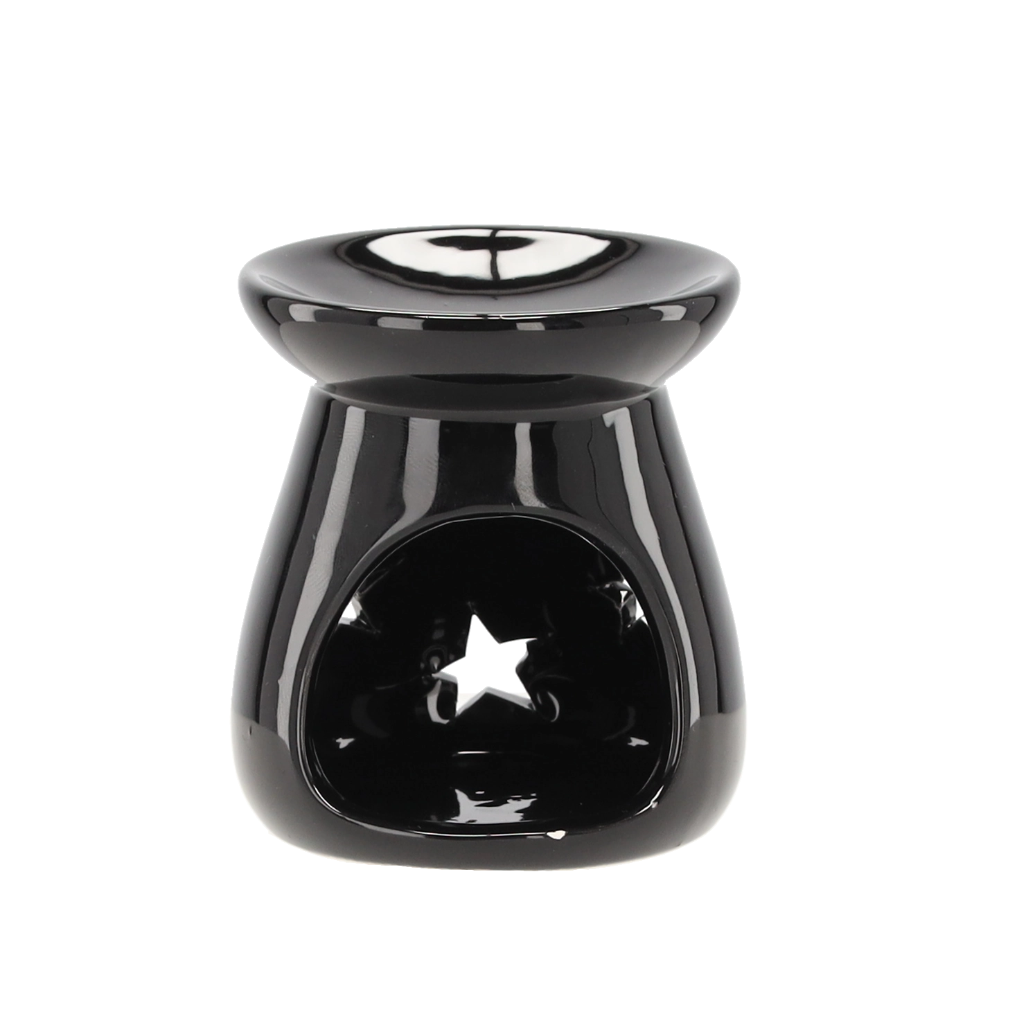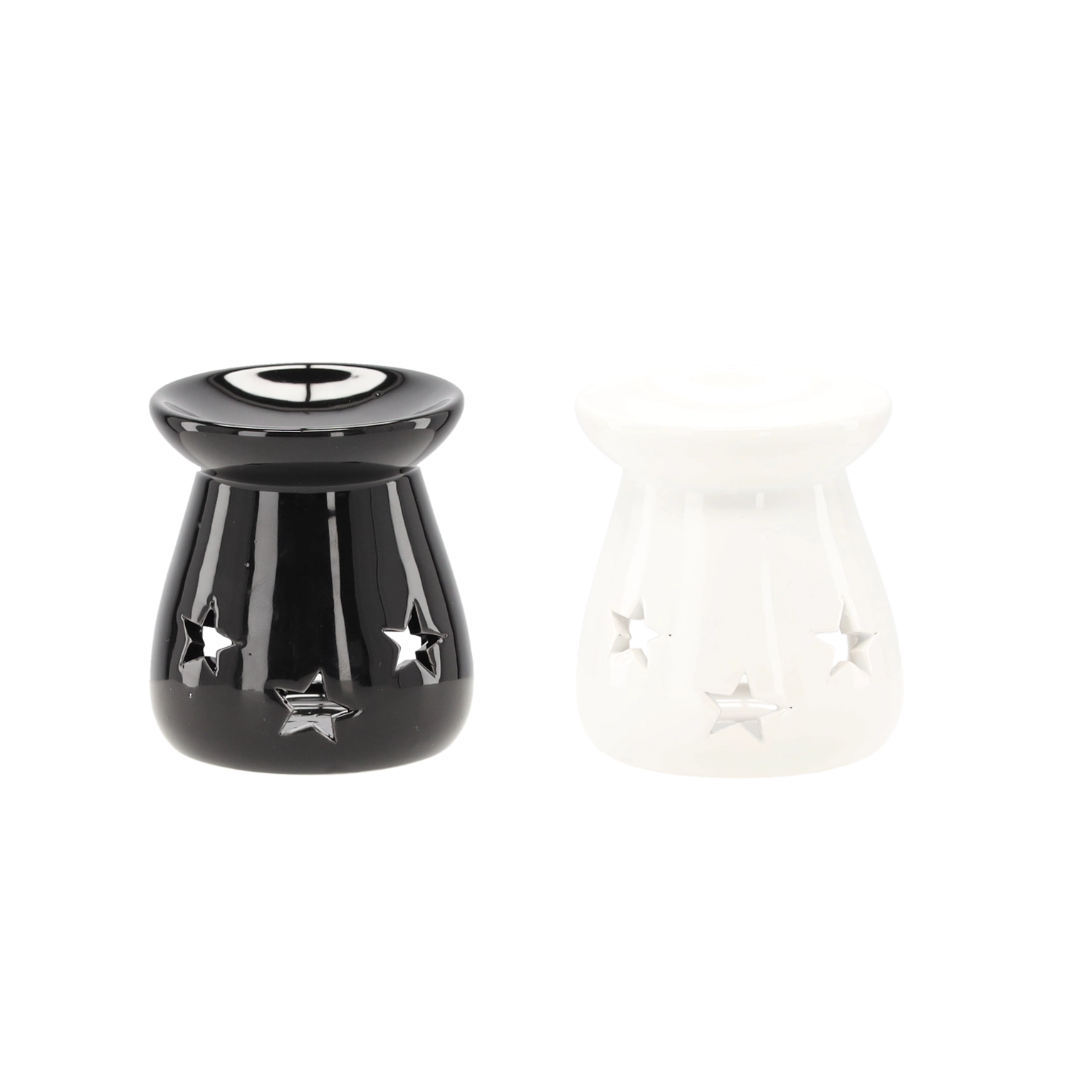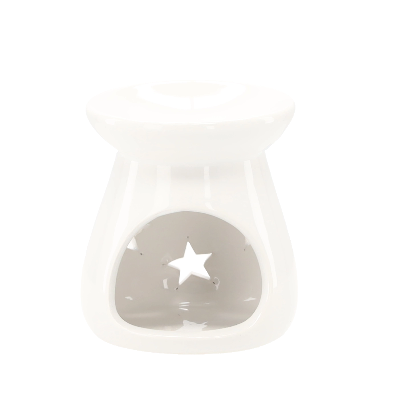 Stilizirana aromalampa od glazirane keramike donosi nježne svjetlosne efekte zahvaljujući izrezima u obliku zvijezda. Gornja posudica namijenjena je za mirisni vosak ili eterična ulja, a donji otvor prima klasičnu čajnu svijeću. Kompaktne dimenzije 7 × 8 cm omogućuju postavljanje na policu, stolić za kavu ili prozorsku dasku.