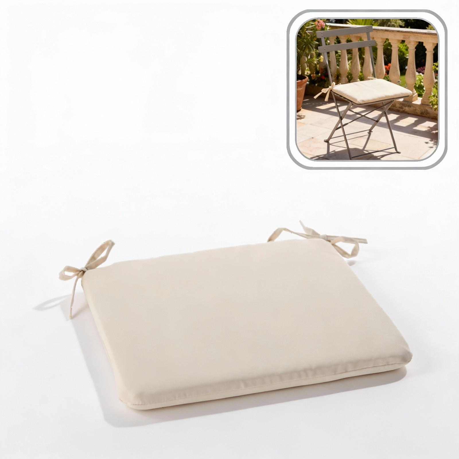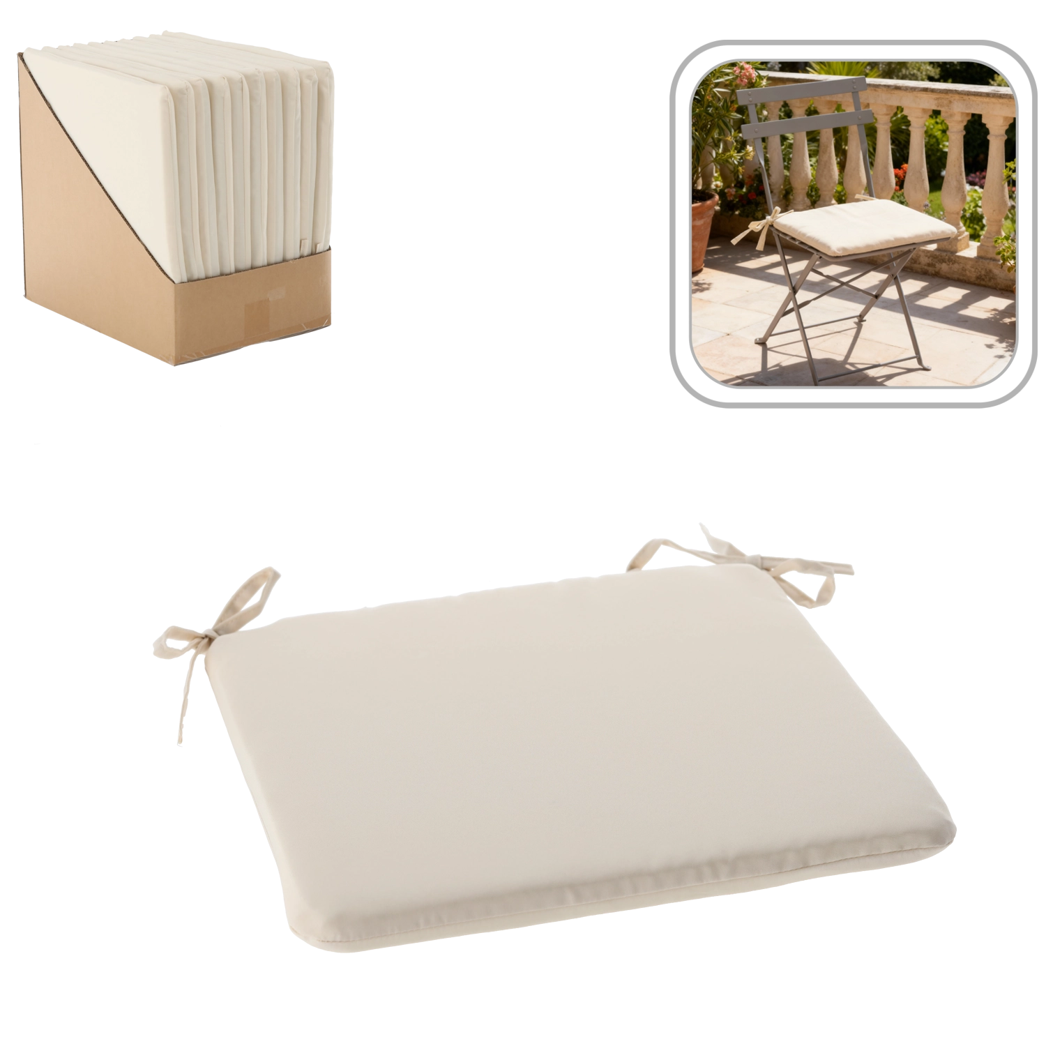 Dodajte svojim stolicama i vrtnom kutku više udobnosti i stila s bež sjedalom 40 × 40 × 3 cm. Zahvaljujući mekoj ispuni nudi udobno sjedenje, praktične vezice za pričvršćivanje drže jastučić na mjestu, a patentni zatvarač omogućuje lako održavanje. Materijal s blagom otpornošću na prskanje idealan je za interijer i terasu.