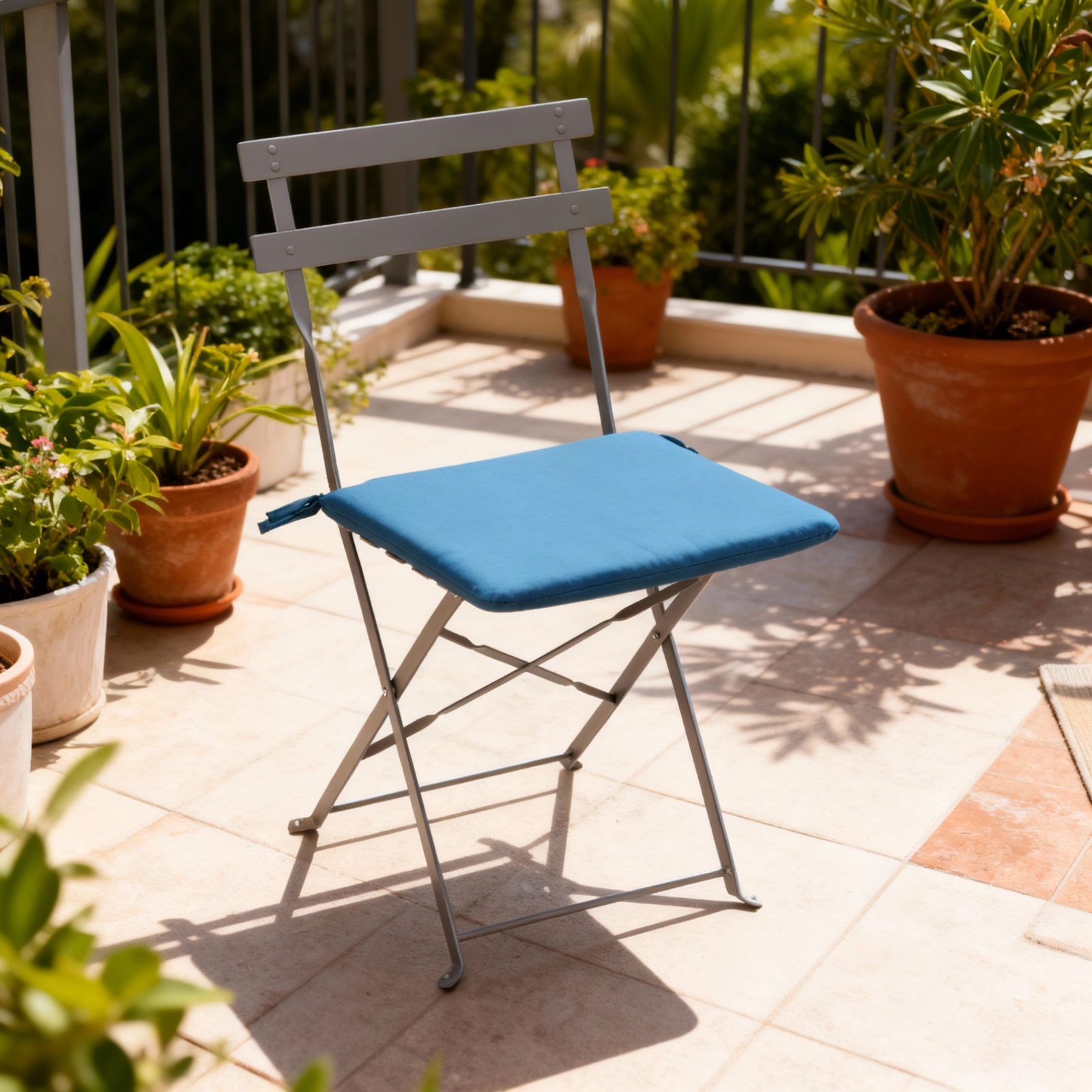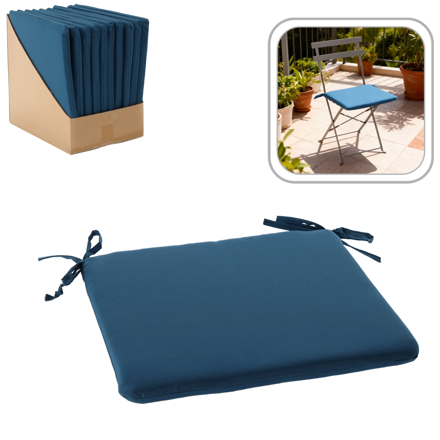 Plava sjedalica za stolicu idealan je izbor za interijer i natkrivene vanjske prostore. Zahvaljujući izdržljivoj poliesterskoj navlaci i jednostavnom održavanju, uživat ćete u udobnosti svaki dan. Integrirane vezice za učvršćivanje sprječavaju klizanje, pa sjedalica ostaje točno tamo gdje treba biti.