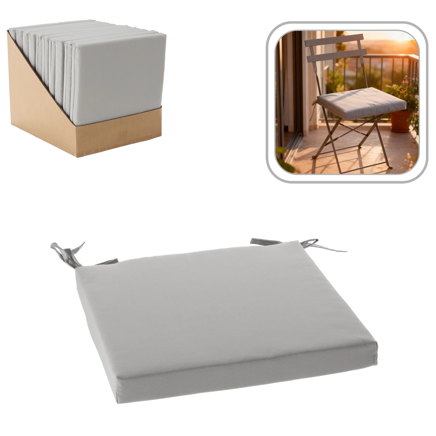 Unaprijedite svoje stolice elegantnim jastučićem 40 × 40 × 5 cm u svijetlosivom tonu. Zahvaljujući mekom podstavljanju pruža dugotrajnu udobnost, dok vodoodbojna navlaka od 100% poliestera olakšava održavanje u kuhinji, blagovaonici i na balkonu.