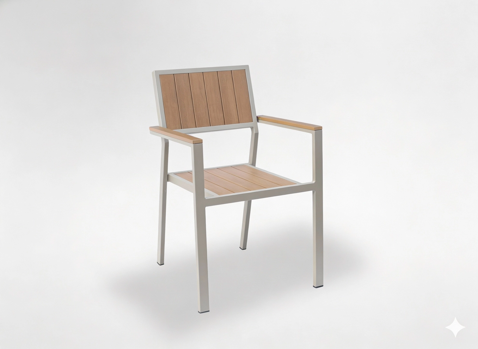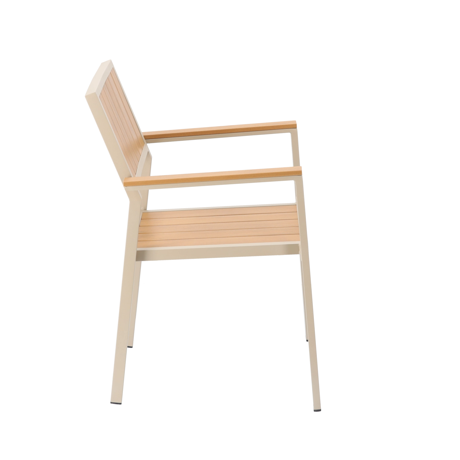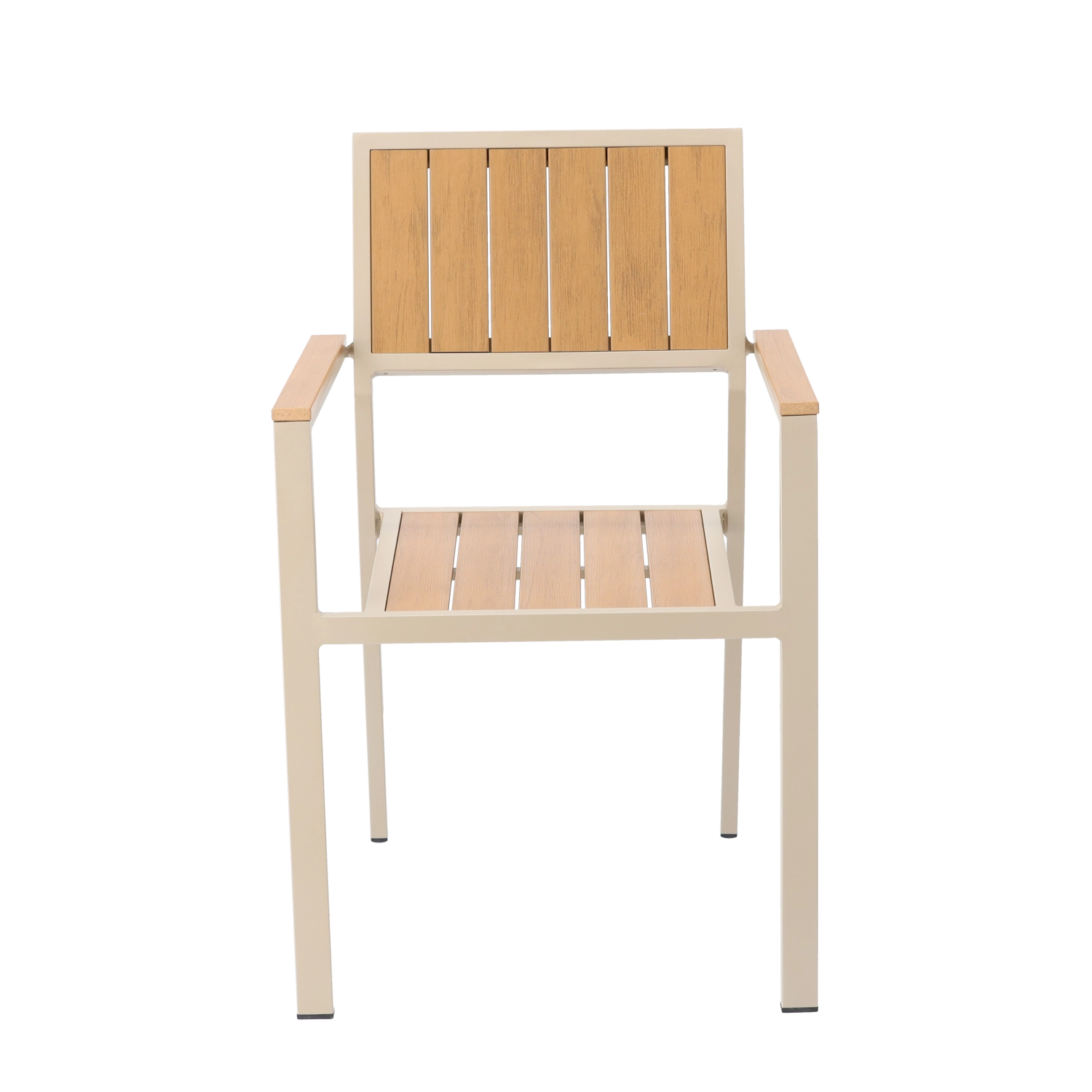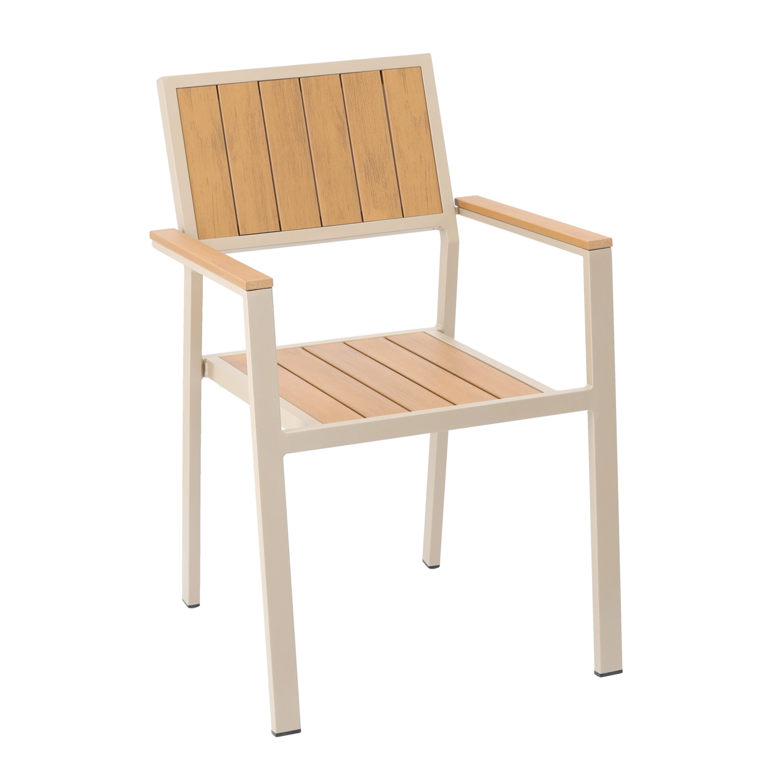 Stilska aluminijska vrtna stolica u bež izvedbi idealan je izbor za vanjsko sjedenje. Praškasto lakirani okvir odolijeva vlazi i suncu, dok letvice s drvnim dekorom pružaju prirodan izgled bez potrebe za redovitim održavanjem. Zahvaljujući promišljenoj konstrukciji s podlakticama stolica nudi udobnost pri svakodnevnoj uporabi.