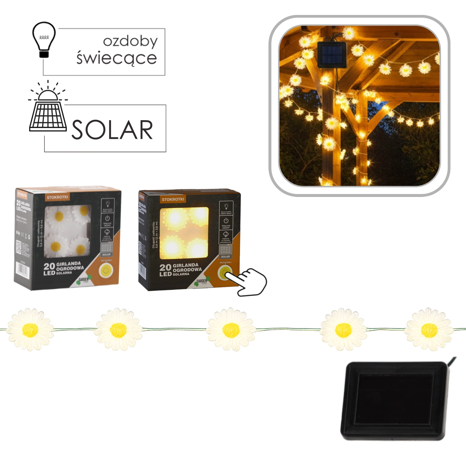 Osvijetlite terasu, balkon i vrt solarnom girlandom s tratinčicama. Nudi 20 LED u nijansi toplo bijela, dvije duljine kabela 2 + 3,8 m, izbor načina rada neprekidno svjetlo ili treptanje te oznaku otpornosti IP44 za vanjsku upotrebu. Napajanje osiguravaju polukristalni solarni panel i punjiva baterija za do 6–7 sati svjetla.