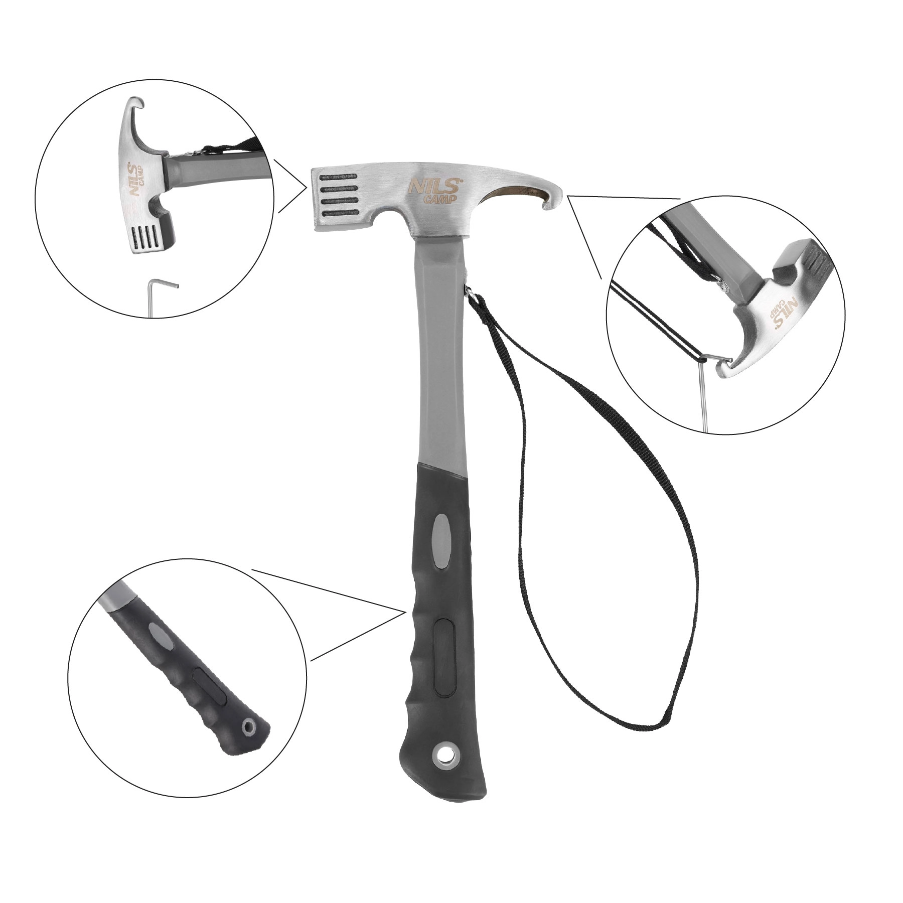 Praktični kamperski čekić NILS Camp pouzdan je partner za postavljanje šatora i vanjske radove. Ima izdržljivu čeličnu glavu za sigurno zabijanje klinova, protukliznu ergonomsku dršku za udoban hvat i remen za zapešće za sigurnije rukovanje. Integrirana kuka za izvlačenje klinova olakšava demontažu šatora čak i na tvrdom tlu.