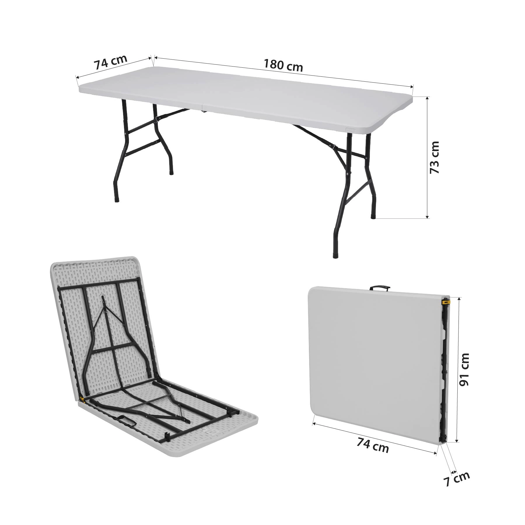 Velikodušna površina 180 × 74 cm pruža dovoljno mjesta za goste, osvježenje i opremu. Ergonomska visina od 73 cm udobna je i za sjedenje i za rad u stajanju. Praktičan sklopivi sustav pretvara stol u kompaktan „kofer” s transportnom ručkom, pa ga lako spremite u automobil, ormar ili ispod kreveta.