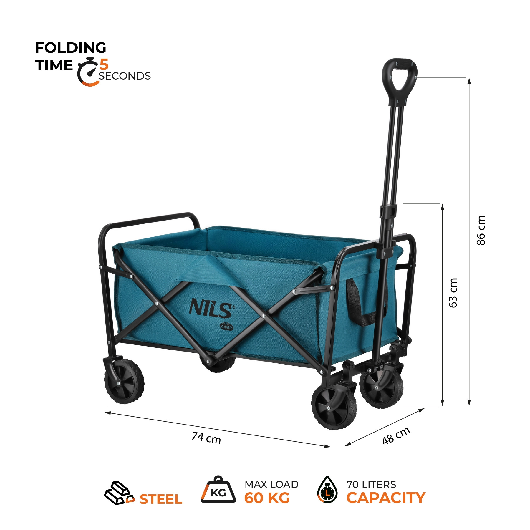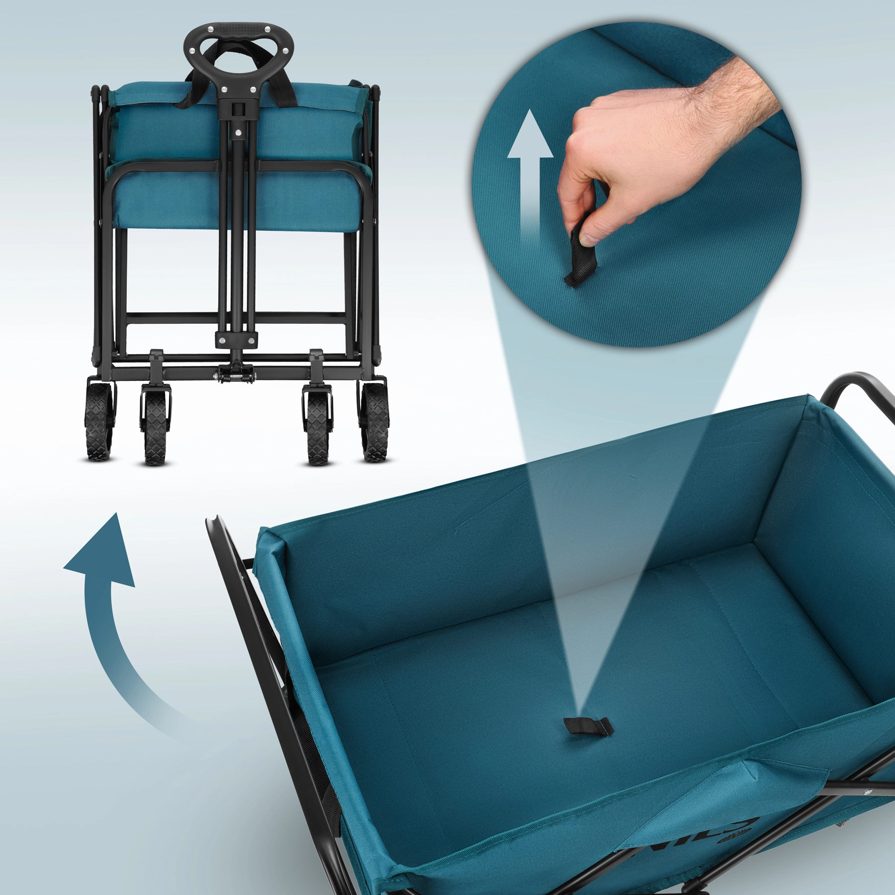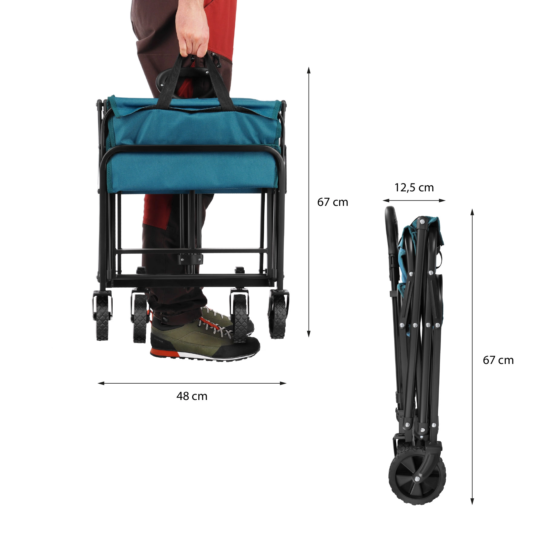 Praktična kamping kolica u tirkiznoj boji idealna su za plažu, piknik, kampiranje i svakodnevnu kupnju. Zahvaljujući brzom sustavu sklapanja u trenu su spremna za uporabu, a nakon aktivnosti lako ih pospremite u prtljažnik automobila ili ormar. Čvrst čelični okvir s praškastim premazom i izdržljiva tkanina 600D Oxford s PVC-om osiguravaju dug vijek trajanja i zaštitu prevezenih stvari.