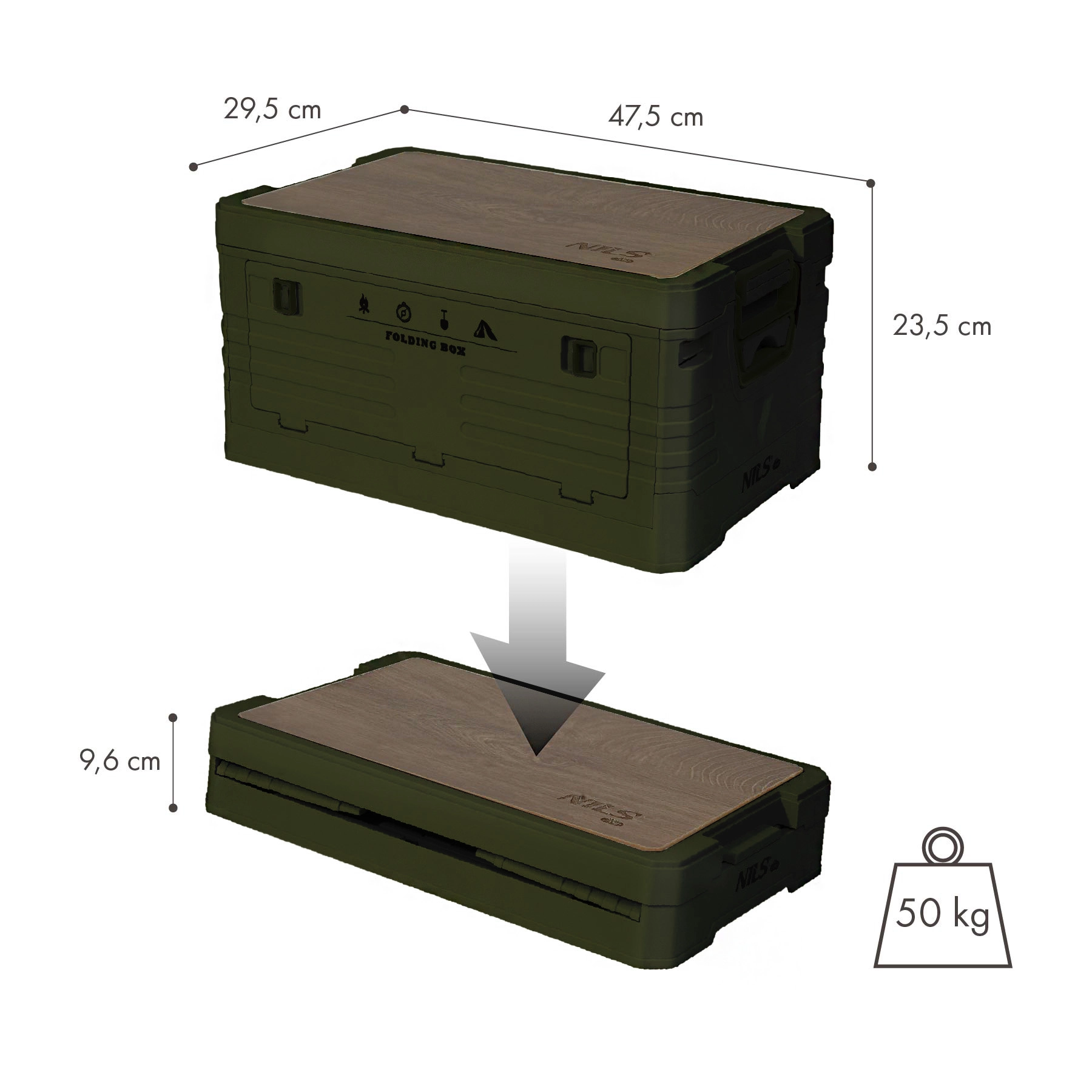 Praktična sklopiva kutija NILS Camp zapremnine 32 l kombinira prostor za pohranu i odvojivu drvenu ploču za upotrebu kao stolić ili radnu površinu. Zahvaljujući čvrstoj PP konstrukciji, mogućnosti slaganja i kompaktnoj visini od 9,6 cm nakon sklapanja idealna je za auto, garažu, dom i kampiranje. Nosivost 50 kg i ergonomske ručke osiguravaju ugodno i sigurno korištenje.