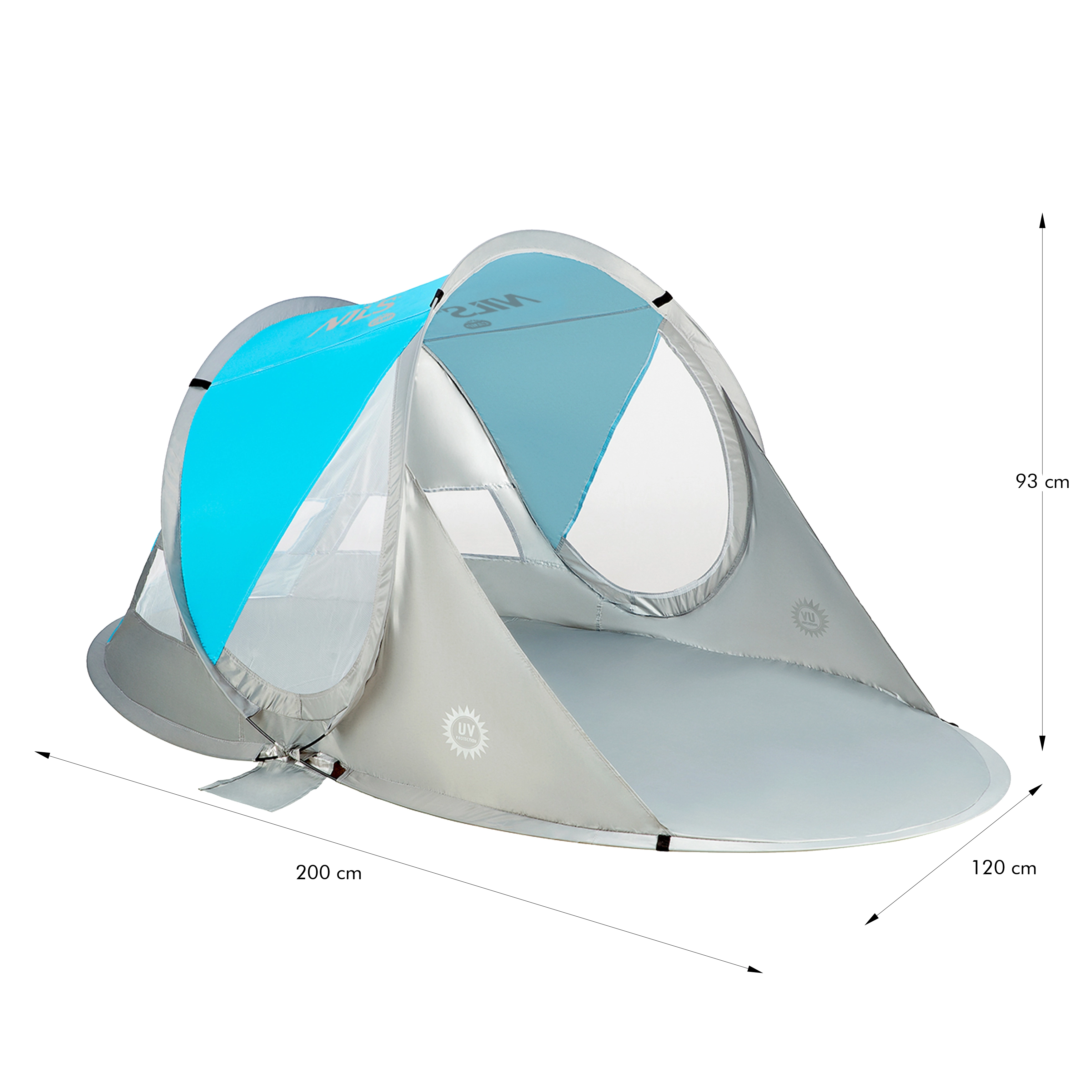 Zahvaljujući UV refleksiji od 96 %, šator pruža učinkovitu zaštitu od štetnog sunčevog zračenja. Podnica dimenzija 200 × 120 cm i visina od 93 cm nude dovoljno prostora za sjedenje i dječju igru. Nakon upotrebe šator lako sklopite jednostavnim pokretom natrag u kompaktno pakiranje promjera 60 cm – idealno za praktično prenošenje i pohranu.