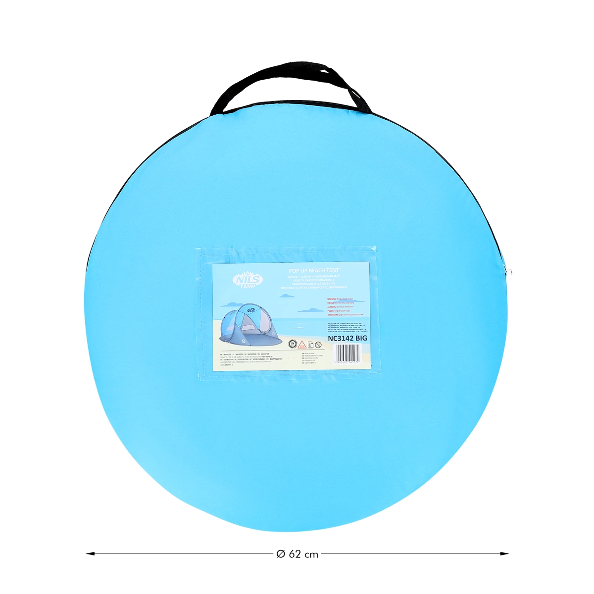 Uživajte u udobnosti i sigurnosti na plaži ili uz bazen sa samorazvijajućim šatorom NILS Camp NC3143 BIG. Nudi trenutačno postavljanje, zaštitu od UV zračenja do 96 %, sjenu i zaklon od vjetra te jednostavno prenošenje u okrugloj torbi. Zahvaljujući dimenzijama 200 × 120 × 93 cm prikladan je za djecu i odrasle, a izdržljiva poliesterska cerada podnosi i manju kišu.