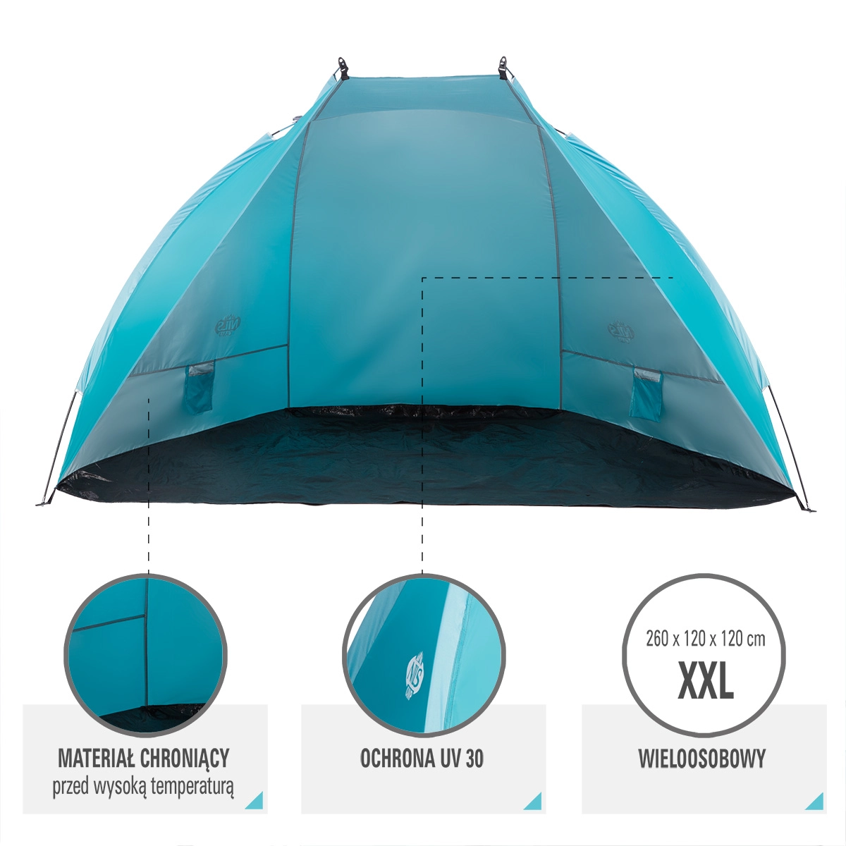 Uživajte u udobnosti i hladu na plaži s prostranim plažnim šatorom NILS Camp u veličini XXL. Pruža zaštitu od UV zračenja, ima vodonepropusno dno i zahvaljujući brzom i jednostavnom postavljanju idealan je za obitelji. Lagana konstrukcija, stabilnost s klinovima i kompaktne dimenzije nakon sklapanja olakšavaju prenošenje i skladištenje.