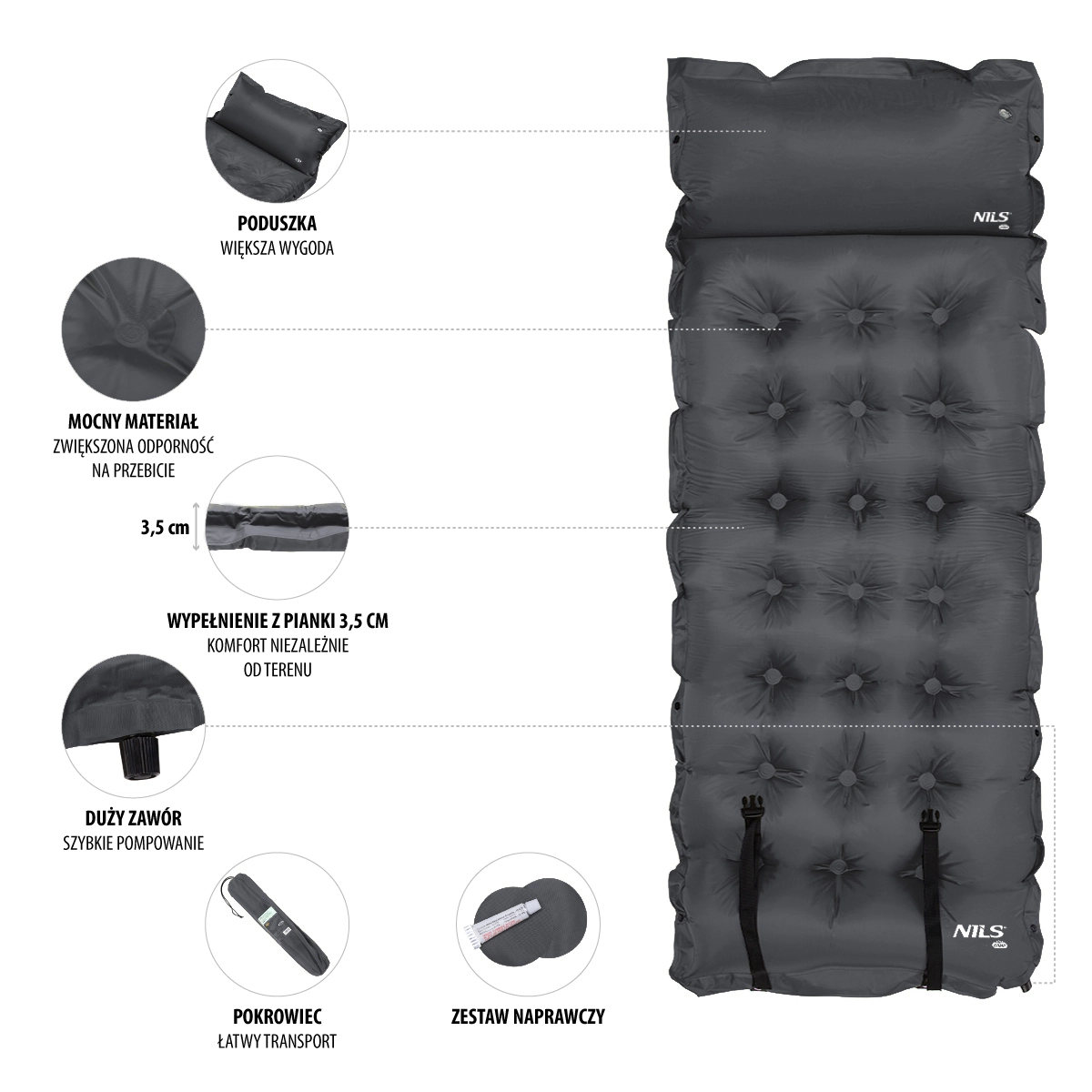 Uživajte u udobnom snu na putovanjima sa samonapuhavajućom karimatkom NILS Camp u tamno sivoj boji. Zahvaljujući unutarnjoj pjeni s otvorenim porama, nakon otvaranja ventila sama će se napuniti zrakom, a vi je samo lako dopuhnete na željenu tvrdoću. Izdržljiv materijal poliester 190T s PVC završnom obradom jamči dug vijek trajanja i na neravnoj podlozi, integrirani jastučić povećava udobnost, a praktične druker-kopče sa strane omogućuju spajanje više karimatki u jednu veliku površinu. U kompletu su i set za popravak te kompresijske trake s vrećom za jednostavno prenošenje. Idealno za kampiranje, planinarenje i putovanja automobilom. Samonapuhavajući sustav, izdržljiv materijal 190T + PVC, integrirani jastučić, mogućnost spajanja karimatki.