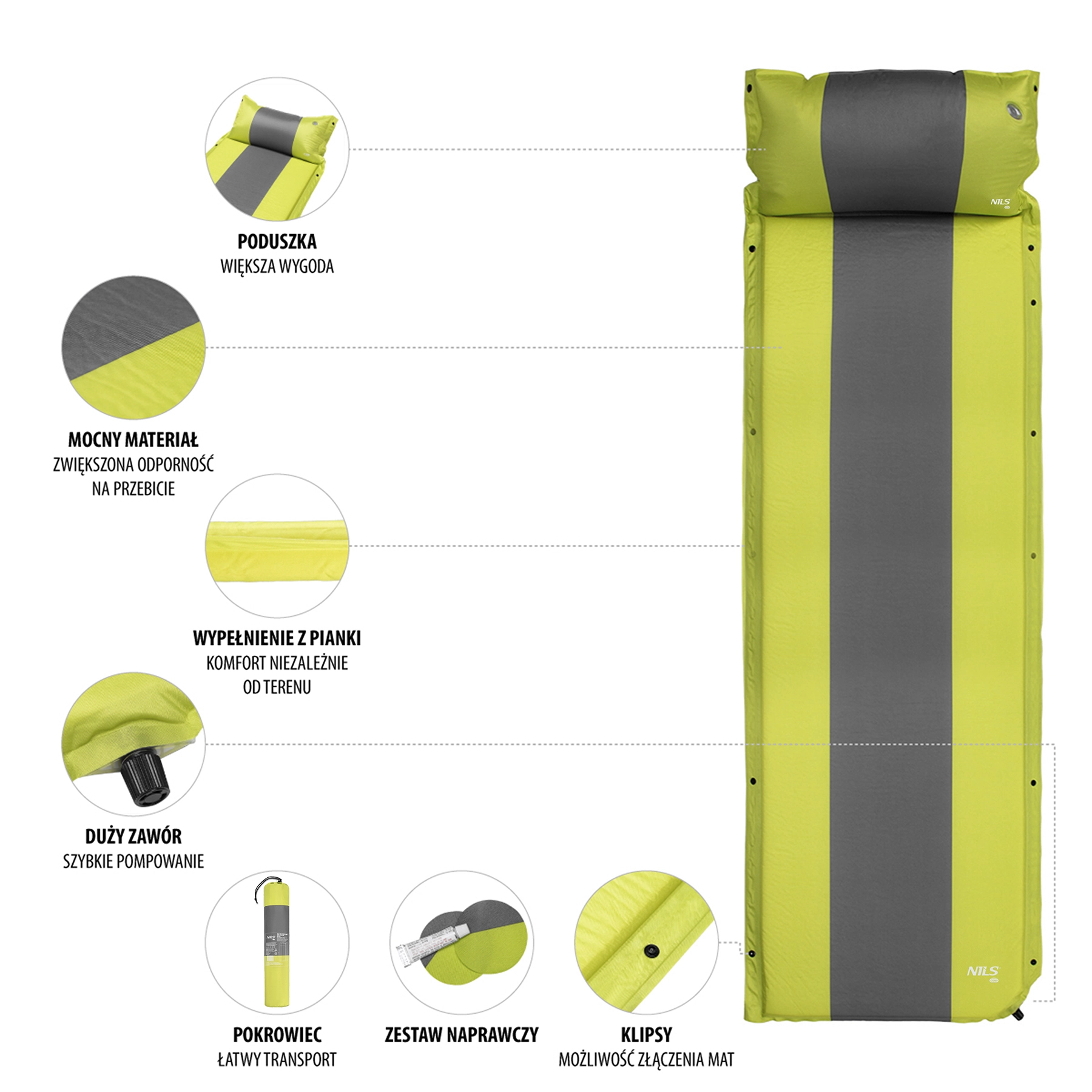 Robusna kombinacija poliestera 75D i PVC-a osigurava visoku izdržljivost i uporabu i na manje ravnoj podlozi. Bočni drukeri za spajanje omogućuju povezivanje više karimatki u jednu veliku površinu – odlično za obiteljske šatore. U pakiranju se nalazi set za popravak, pričvrsne trake s kopčama i transportna vreća za lako nošenje.