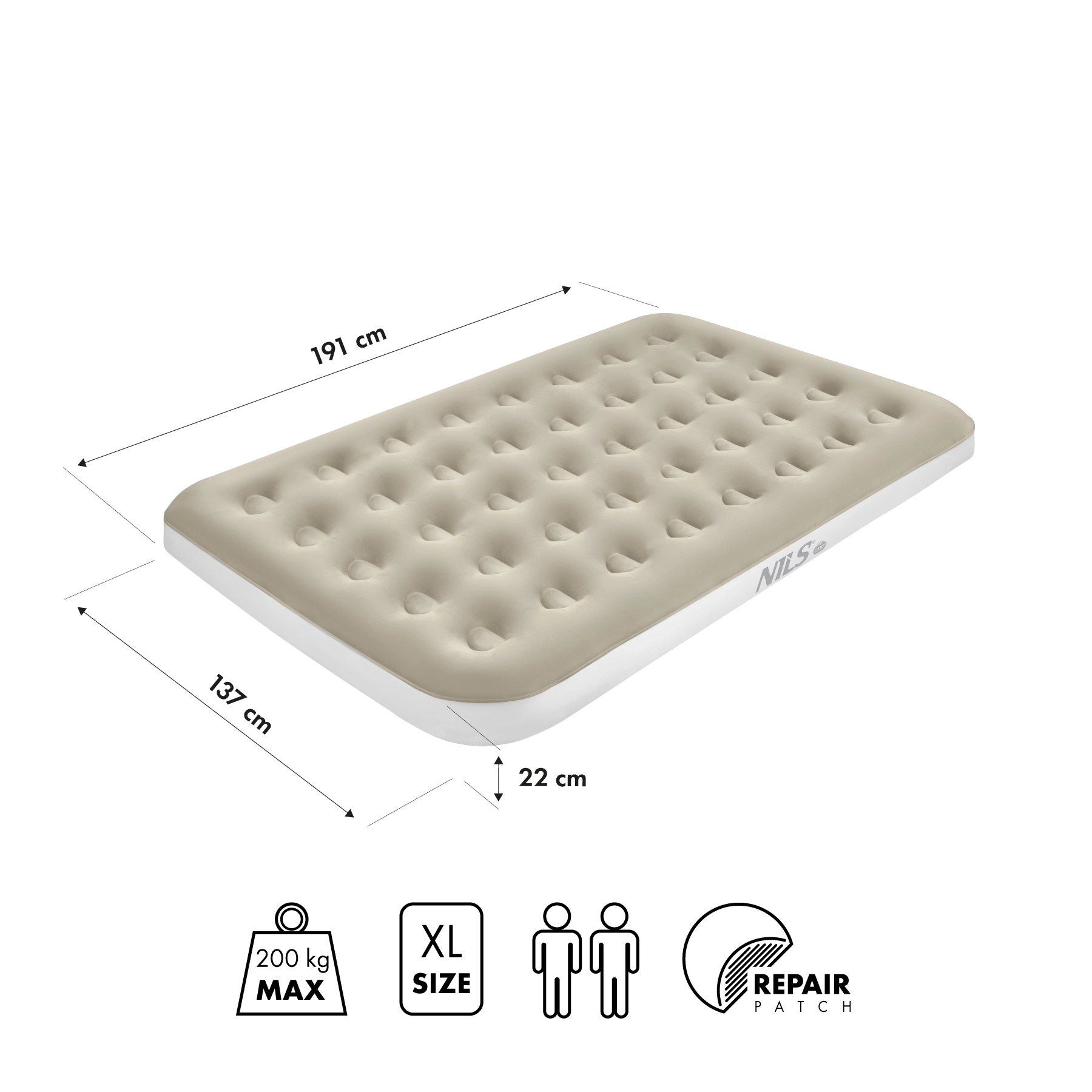 Napuhujući madrac NILS Camp odličan je izbor kao kućni pomoćni ležaj i kao udoban ležaj za šator. Dimenzije 191 × 137 × 22 cm odgovaraju standardnom bračnom ležaju, pa će udobno smjestiti dvije osobe ili pružiti dodatni prostor za pojedinca. Visina od 22 cm osigurava učinkovitu izolaciju od hladnoće i neravnina terena te ugodnu udobnost pri spavanju.