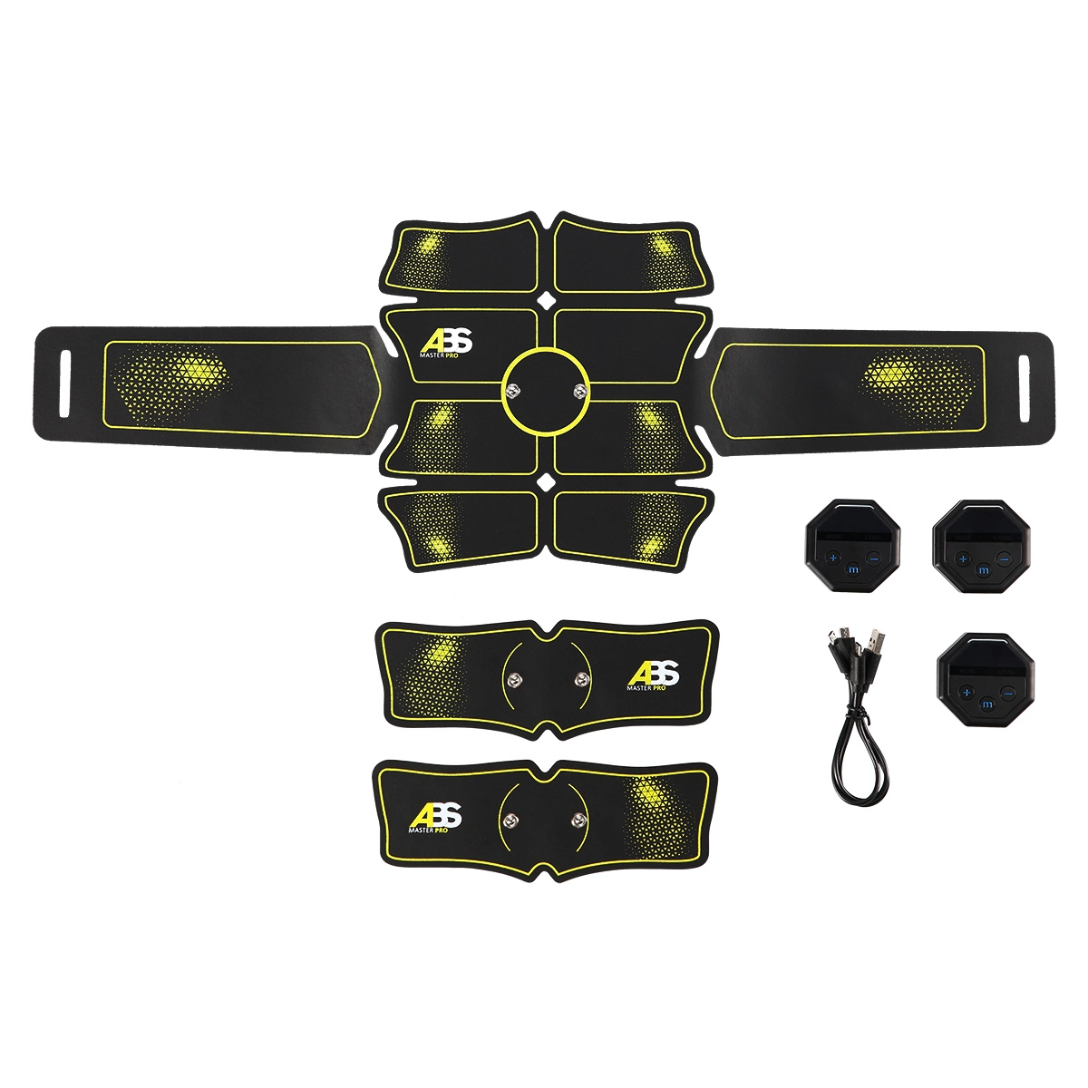 Jedna velika trbušna elektroda i dvije manje za ruke ili noge, tri upravljačke jedinice i kabel za punjenje – sve što vam treba za učinkovit EMS trening kod kuće.