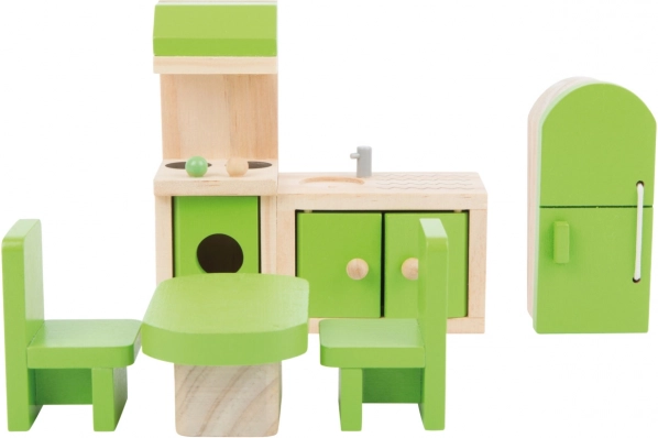 Ovaj detaljno izrađen kuhinjski set za kućice nudi sve što mali kuhari trebaju – sudoper, štednjak, hladnjak, stol i dvije stolice u ugodnoj kombinaciji prirodnog drva i svježih zelenih akcenata. Zahvaljujući masivnom drvu, namještaj je stabilan i spreman za svakodnevnu igru.