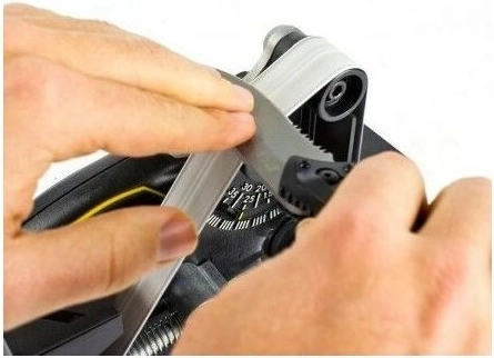 Robusna metalna konstrukcija, glatki vodilni koloturi i kutni vodič osiguravaju konzistentne rezultate i ponovljivost. Veća kontaktna površina trake pomaže stvoriti ujednačene fazete i gladak brus, kako na kuhinjskim, tako i na outdoor i radnim noževima.