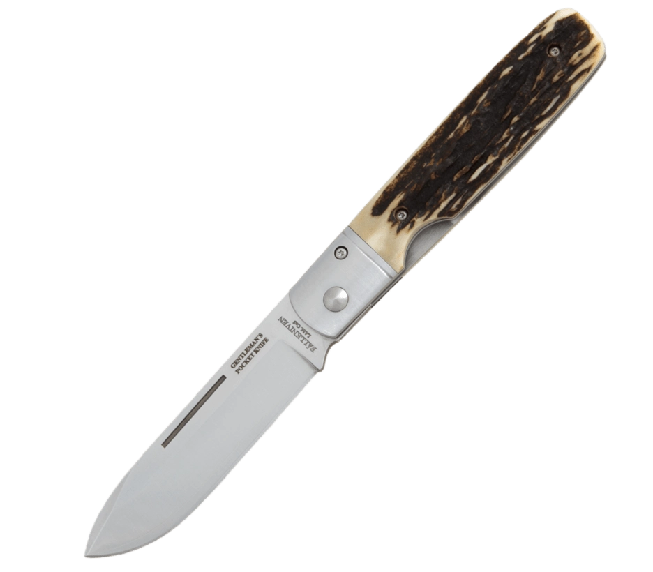 Elegantni džepni nož Fällkniven GPs s retro izgledom za lovce i gospodu. Nudi laminirani kobaltni čelik s tvrdoćom HRC 60, klasičnu oštricu Drop Point, pouzdanu Linerlock sigurnosnu kočnicu i jedinstvenu dršku od jelenjeg roga. U paketu je i stilska semiš futrola.