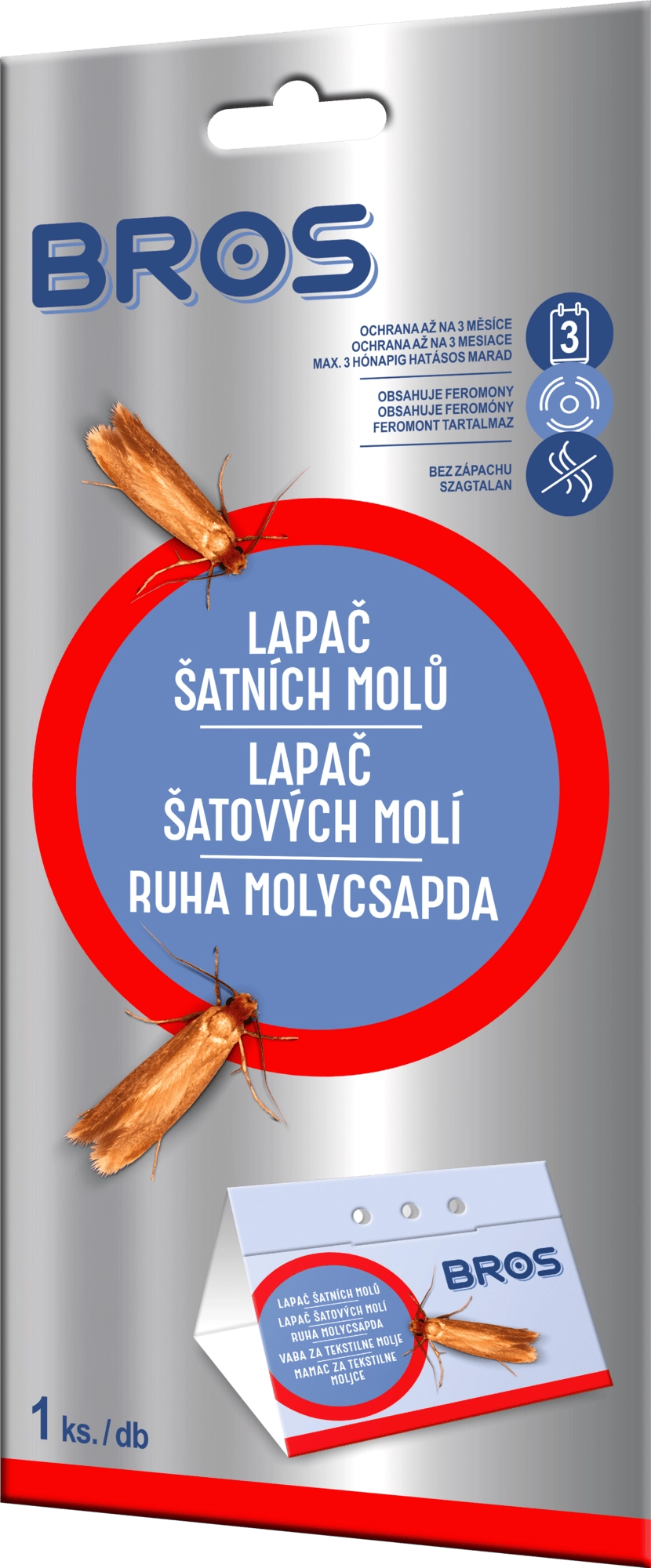 Siguran i učinkovit način za zaštitu odjeće: Bros klopka za odjevne moljce koristi prirodni feromon za privlačenje i hvatanje odraslih moljaca u ormarima i ladicama. Djeluje do 3 mjeseca te je bez mirisa i bez kemijskih insekticida.