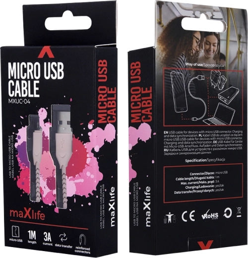 Izdržljiv i stilski Maxlife microUSB kabel duljine 1 m za brzo punjenje i pouzdan prijenos podataka. Zahvaljujući najlonskoj pletenici i ojačanim konektorima podnosi svakodnevnu upotrebu, podržava struju do 3 A i idealan je za telefone i druge uređaje s microUSB priključkom.