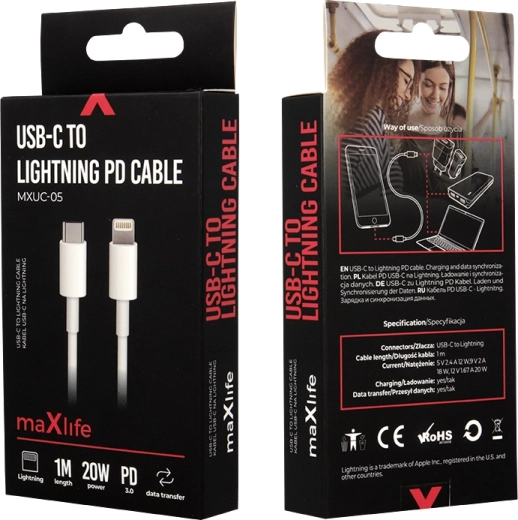 Tražite pouzdan kabel za svoje uređaje s Lightning priključkom? Maxlife USB‑C – Lightning u elegantnoj bijeloj boji donosi brzo punjenje Power Delivery 20 W i stabilnu sinkronizaciju podataka. Zahvaljujući duljini od 1 metra lako doseže od punjača do telefona, bilo za stolom ili na putu.
