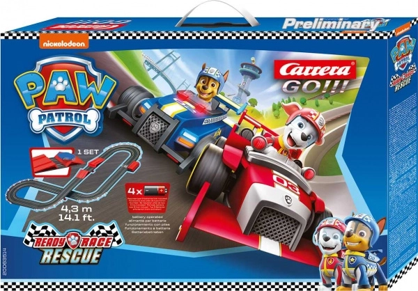 Zabavna autostaza CARRERA GO s motivom Psi patrola donosi djeci od 5 godina 4,3 m dug krug s autićima Chase i Marshall. Set nudi skakaonicu, most, ravnine i zavoje te napajanje na baterije uz mogućnost dokupa transformatora. Kompatibilno s autima i dijelovima GO!!! za još više zabave.