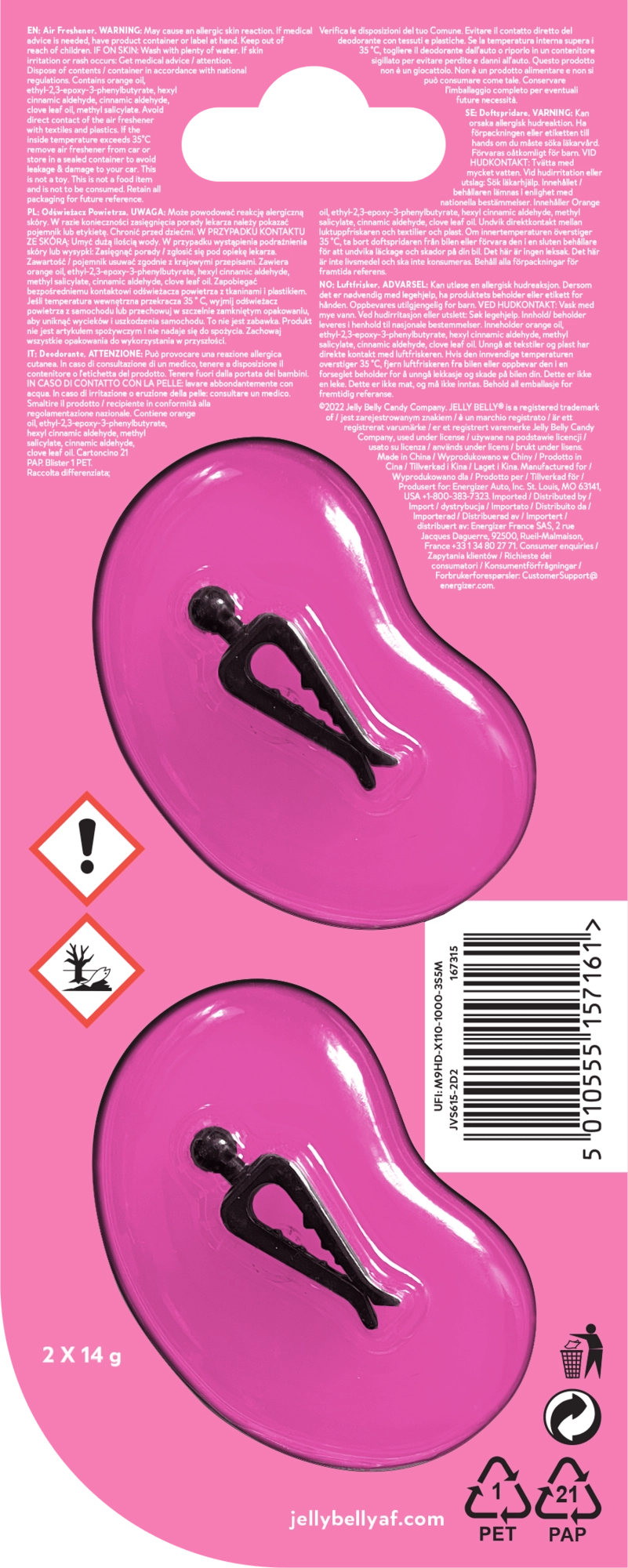 Ikoničan miris žvakaće gume uljepšat će svaku vožnju i radni dan. Osvježivač zraka Jelly Belly u praktičnom clip-on izvedbi lako se umeće u ventilacijske otvore i u trenu zamiriše interijer.
