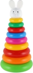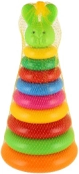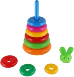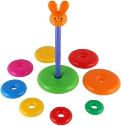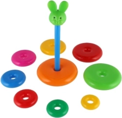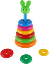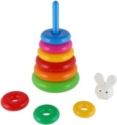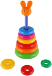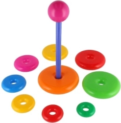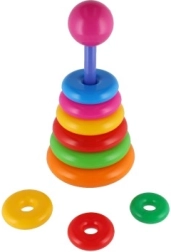 Ova složiva piramida s obojenim prstenovima idealna je prva slagalica. Djeca navlače prstenove na šipku i slažu ih od najvećeg do najmanjeg, čime prirodno vježbaju finu motoriku, strpljenje i logičko razmišljanje. Osnovu čini čvrsto plastično postolje sa šipkom i uklonjivim gornjim dijelom (ovisno o varijanti).