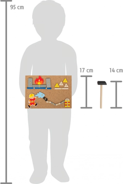 Ova kreativna čekić-igra idealan je izbor za djecu koja vole stvaranje i svijet vatrogasaca. Zahvaljujući jednostavnom sustavu dijelova s predizbušenim rupama i sigurnom drvenom čekiću, djeca lako slažu vlastite motive na plutenu ploču ili mogu koristiti priložene obostrane kartice s prijedlozima motiva.