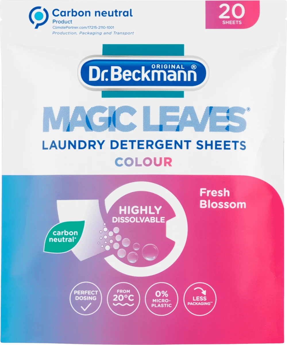 Maramice za pranje Dr. Beckmann Magic Leaves Color održavaju živopisne boje i osiguravaju dubinsko čišćenje već od 20 °C. Jedna u vodi topiva maramica pomaže zaštititi boje, sprječava prijenos boje i idealna je i za putovanja zahvaljujući ultralaganom i kompaktnom pakiranju.