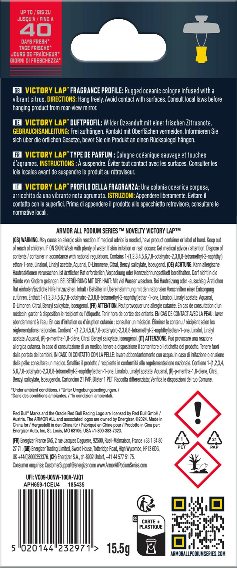 Promijenite atmosferu svog automobila jednim potezom. Viseća kartica ARMOR ALL Oracle Red Bull Victory Lap unosi u interijer energičan i svjež miris koji kombinira oceanski kolonjski s citrusnim akcentima. Dizajn i aroma nastali su u suradnji s timom ORACLE RED BULL RACING, pa uz praktičnu funkciju dobivate i sportski stil.