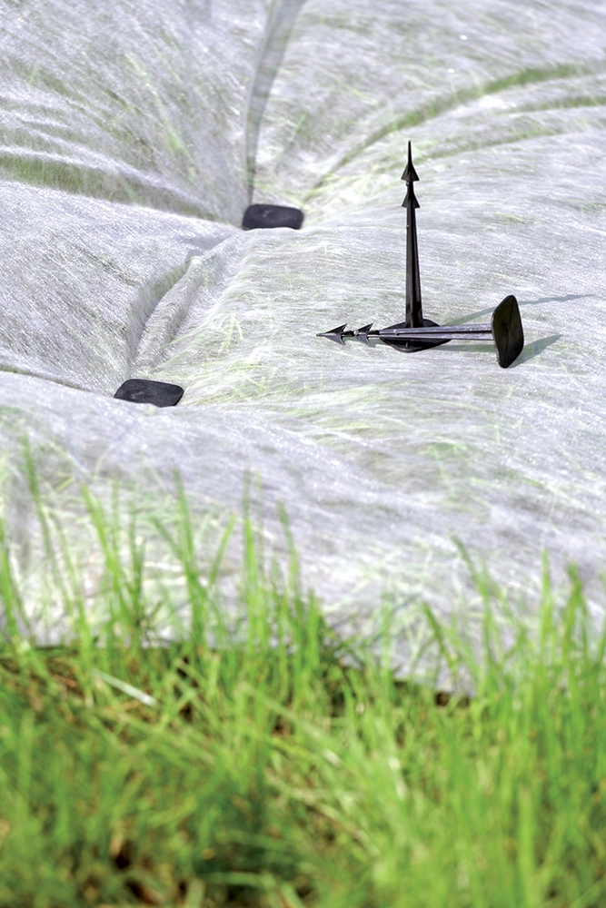 Plošna, široka glava ravnomjerno pritišće agrotekstil ili foliju uz podlogu, čime se smanjuje podizanje, podvlačenje vjetra i pomicanje materijala.