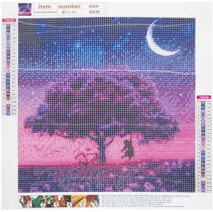 Motiv stabla u ružičasto‑ljubičastim tonovima s polumjesecom stvara očaravajući sjajni efekt koji dolazi do izražaja i u okviru i bez njega. Dijamantno slikanje idealno je za smirivanje uma, razvoj fine motorike i kreativnosti – prikladno za početnike i napredne.