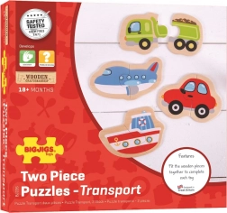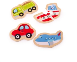 Ovaj set drvenih puzzli donosi četiri omiljena vozila koja djeca lako slažu od dva čvrsta dijela. Jednostavni oblici, izražajne boje i ugodna drvena izrada pozivaju na ponavljanu igru te prirodno potiču razvoj govora, prepoznavanje oblika i boja te koncentraciju.