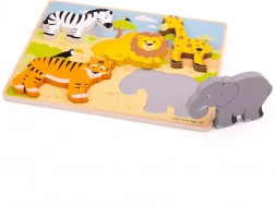 Izrađeno od kvalitetnog, odgovorno pribavljenog drva i dizajnirano tako da ispunjava važeće europske sigurnosne norme. Slagalica sadrži 5 velikih dijelova sa safari motivima, koji djeci donose radost otkrivanja i učenja.