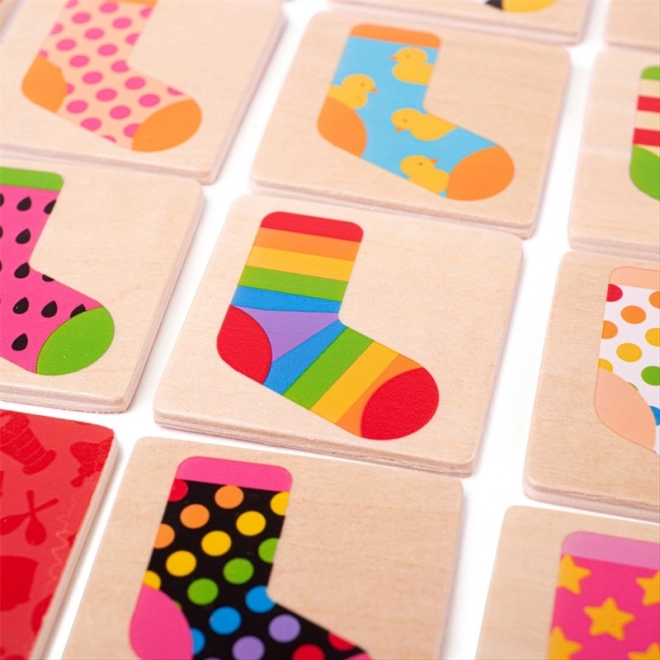 Obogatite vrijeme igre s djecom uz drveno pexeso s čarapama. Ova igra stimulira pamćenje i podržava koncentraciju i razvoj strateških vještina. Sve što vam treba je rasporediti 32 drvena igraća dijela licem prema dolje i početi otkrivati po dva istovremeno. Poteškoća postupno raste, a igrači nastoje povezati parove čarapa i usvajati nove strategije.