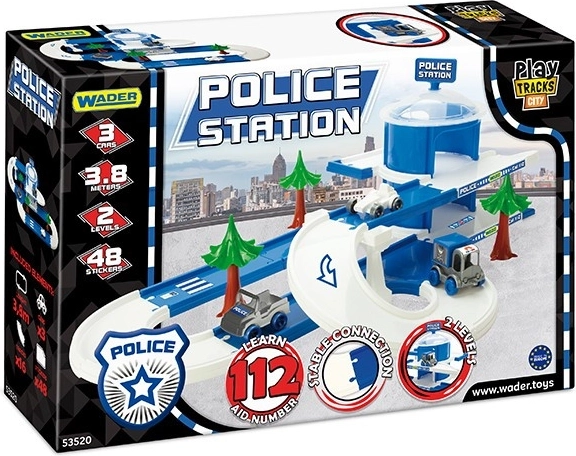 Zabavna policijska postaja Wader Play Tracks City donosi djeci od 1 godine akcijske vožnje na višerazinskoj stazi dugoj 3,8 m. U kompletu su dvoetažna postaja, 3 policijska autića Kid Cars (policijski automobil, kombi, džip) i dekoracije s naljepnicama. Zahvaljujući jednostavnoj montaži i sigurnoj, izdržljivoj plastici potiče maštu i finu motoriku te je sjajan poklon.