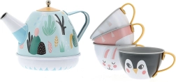 Ovaj kvalitetni metalni čajni set razveselit će sve male domaćine i domaćice. Unutar čajnika skriven je navijajući glazbeni mehanizam koji se pri naginjanju oglasi ugodnom melodijom i pretvara svako posluživanje čaja u mali ceremonijal. Pastelne boje, simpatični životinjski motivi i čiste linije čine set prekrasnim poklonom i stilskim dodatkom dječjoj sobi.