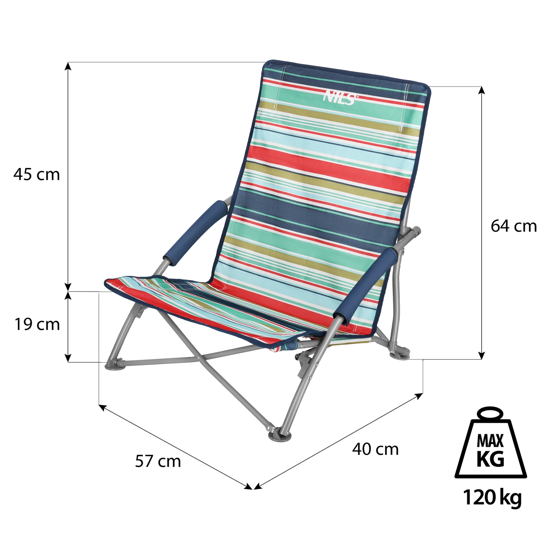 Za maksimalnu udobnost stolica ima pjenaste naslone za ruke i nisko sjedište idealno za plažu. Kružne plastične nožice povećavaju stabilnost, sprječavaju klizanje i ne propadaju u mekanoj podlozi poput pijeska. Nakon sklapanja stolica stane u priloženu transportnu vreću, što ćete cijeniti pri putovanju i pohrani.