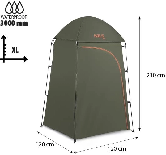 Uživajte u punoj udobnosti i privatnosti izvan doma. Kabina NILS Camp idealna je kao mobilna svlačionica, tuš kabina ili toaletni šator. Visoki strop od 210 cm i tlocrt 120 × 120 cm osiguravaju dovoljno mjesta za udobno kretanje i vješanje tuš crijeva.