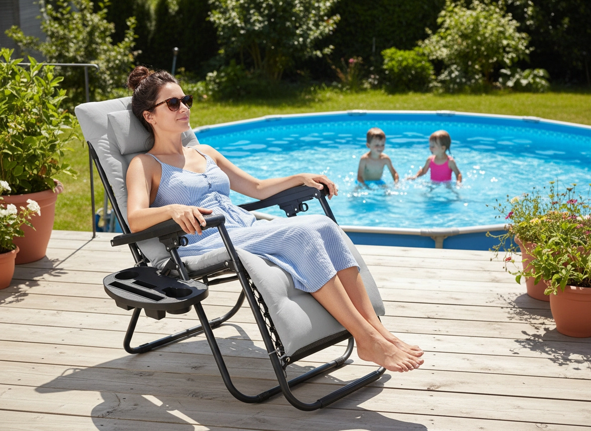 Elegantna relaksacijska ležaljka kombinira izdržljiv čelični okvir s prozračnom tkaninom 1x2 Textilene i mekanim sivim jastukom. Lako podešavate optimalan položaj ležanja, a zahvaljujući sklopivom mehanizmu ležaljku jednostavno prenosite i spremate. Praktični odlagališni stolić uz naslon prima piće, telefon ili sitnice kako biste sve imali pri ruci.