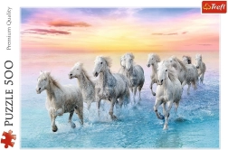 Slagalica koja sadrži 500 komada, prikazujući ljepotu i eleganciju bijelih konja u punom trku. Sastavljanjem ove slagalice dobit ćete sliku dimenzija 48x34 cm.