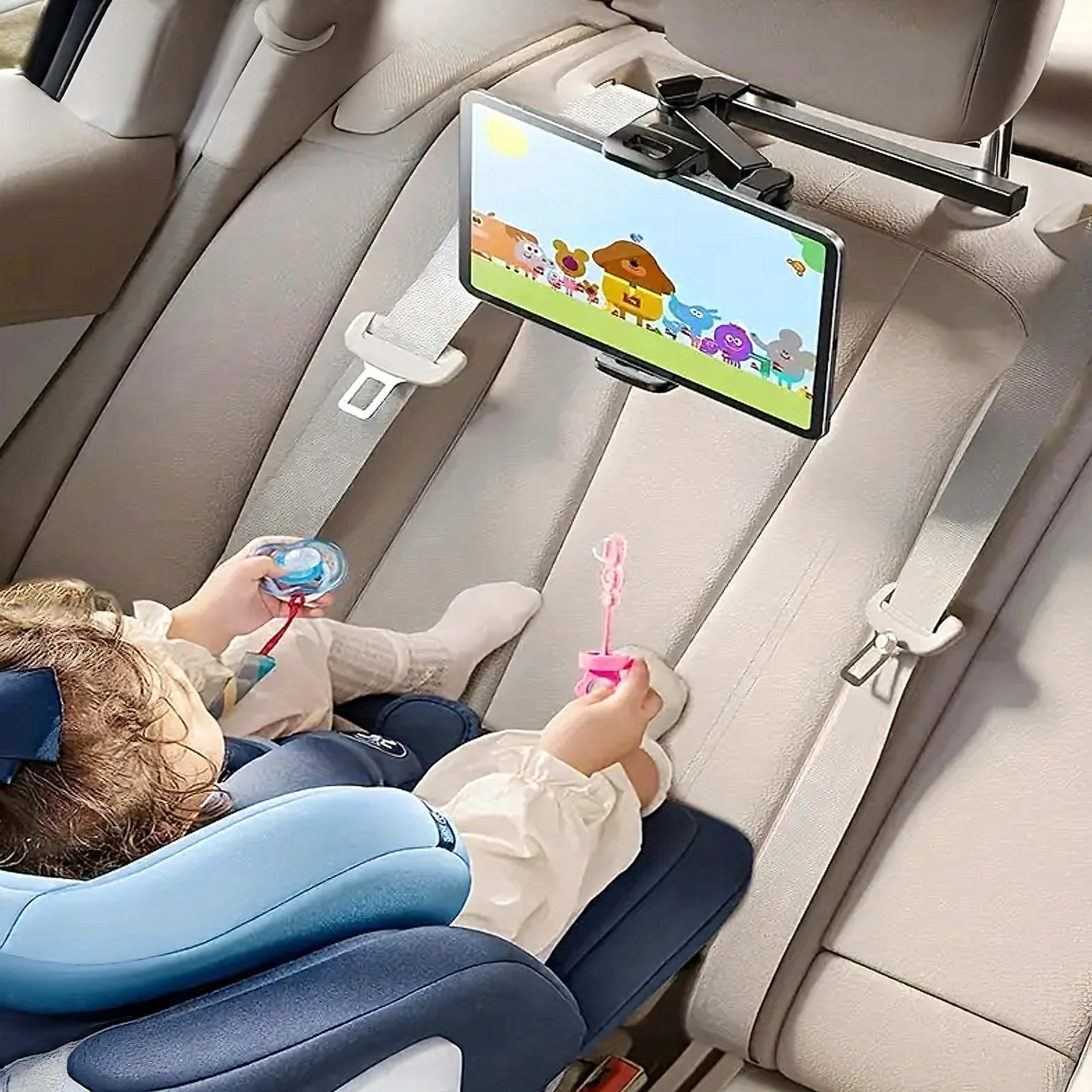 Držač se lako pričvrsti između šipki naslona za glavu i za nekoliko minuta spreman je za stražnje putnike – bez alata.