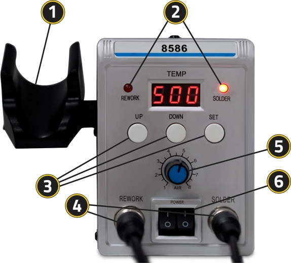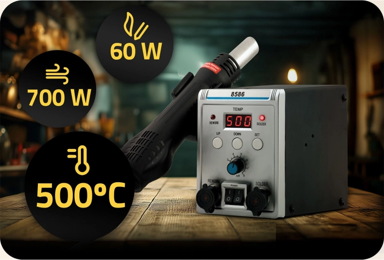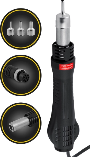 - Hot air (100–500 °C / 700 W): precizno usmjeravanje topline zahvaljujući 5 nastavaka, idealno za odlemljivanje SMD, BGA reballing, termo bužire i uklanjanje ljepila.
