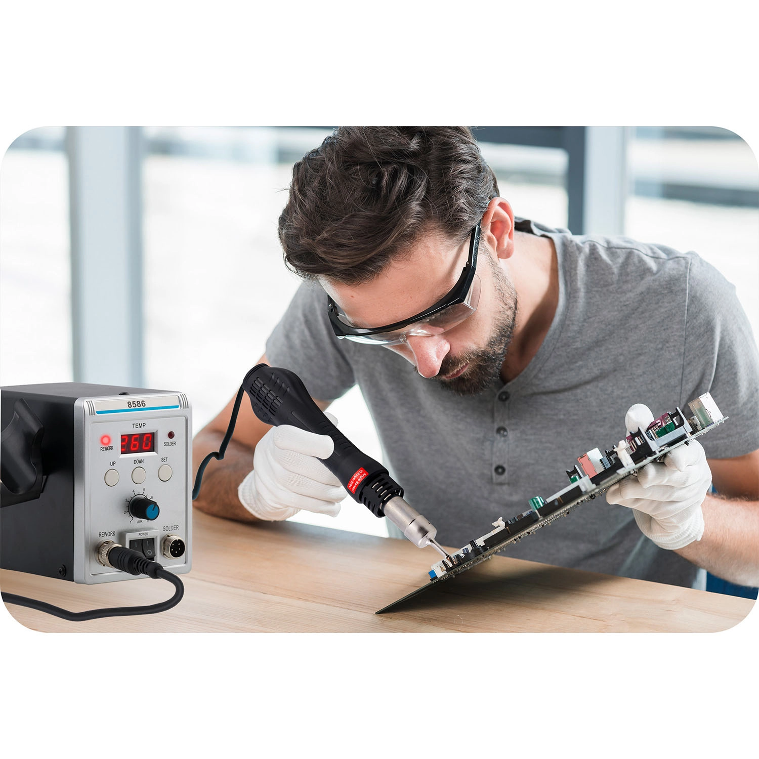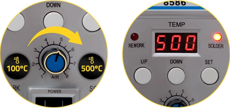 Lemljenje i rework u jednom – kombinacija vrućeg zraka i klasične lemilice proširuje mogućnosti od THT i SMD montaže do BGA reballinga. Pregledni LCD zaslon i tipke UP/DOWN/SET olakšavaju precizno podešavanje, dok regulacija protoka zraka (Air) osigurava nježno i ravnomjerno zagrijavanje bez oštećenja komponenti.